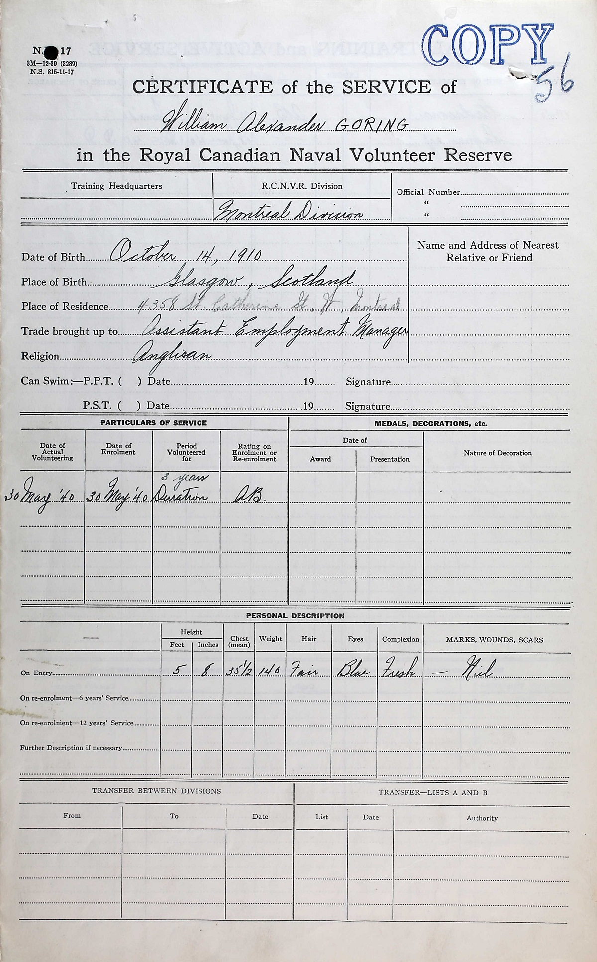 Able Seaman William A. Goring age 30 was a native of Glasgow, Scotland. He lived here with his mother, Mrs. Georgina Goring, having come to Montréal at the age of 15. Prior to enlisting he was employed as Assistant Manager of the Employment Officer for T. Eaton Co. of Montreal for over 10 year. He joined the Royal Canadian Naval Volunteer Reserves in June1940, and left Canada for overseas in October 1940.