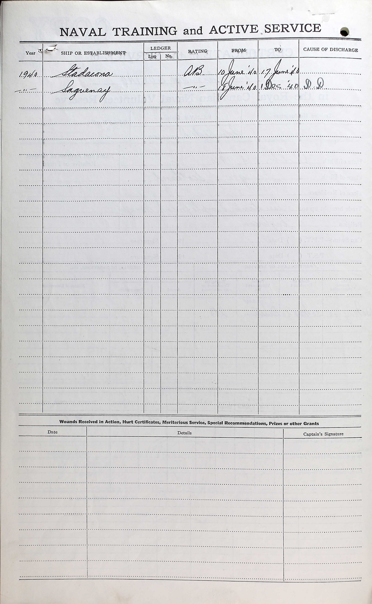 Ships served in: MONTREAL "A" COMPANY, RCNVR - Enlisted 29 Nov 1927 and served until Feb 1930 MONTREAL DIVISION RCNVR - Enlisted 30 May 1940 as an AB, RCNVR HMCS STADACONA - Drafted to STADACONA 06 Jun 1940 as an AB, RCNVR HMCS SAGUENAY - Drafted to SAGUENAY 19 Jun 1940 as an AB, RCNVR