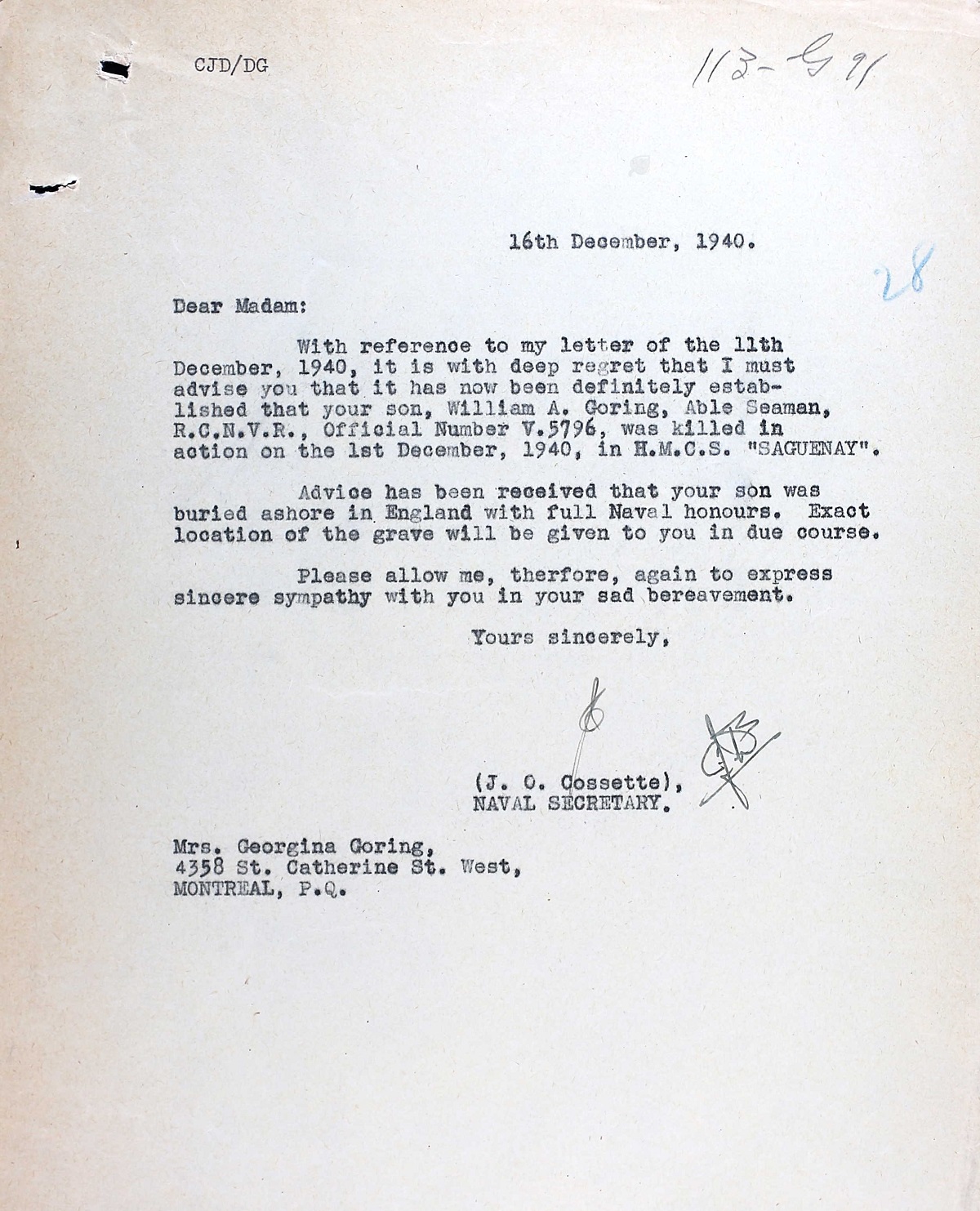 GORING, William Alexander, AB, V5796, RCNVR, killed - 01 Dec 1940, HMCS SAGUENAY - Son of Edwin and Georgina Goring, of Montreal, Quebec.