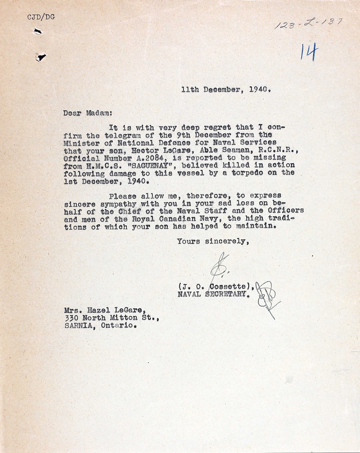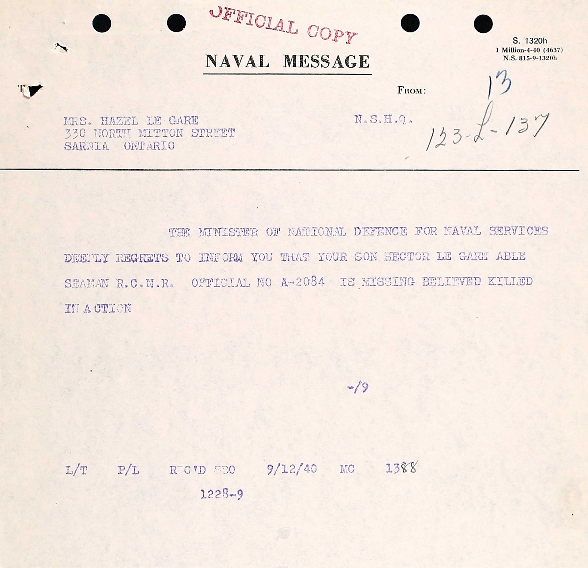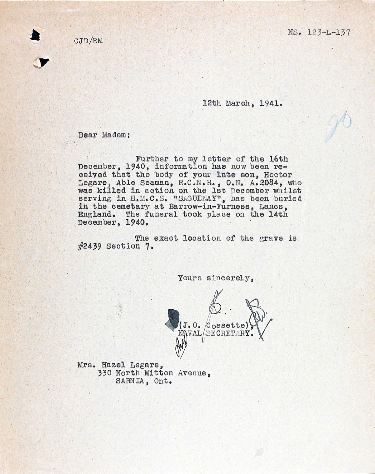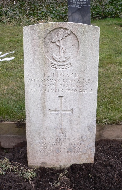 Able Seaman Le Gare was killed when HMCS SAGUENAY, while escorting convoy HG.47, was torpedoed by the Italian submarine Argo 300 miles west of Ireland. With her bows wrecked and 21 dead, SAGUENAY made Barrow-in-Furness largely under her own power, and was under repairs until 22 May 1941. His body was recovered and he was buried in Barrow, Lancashire, England on 14 Dec 1940.