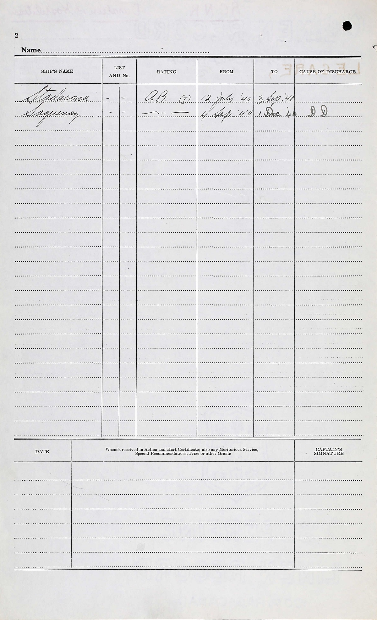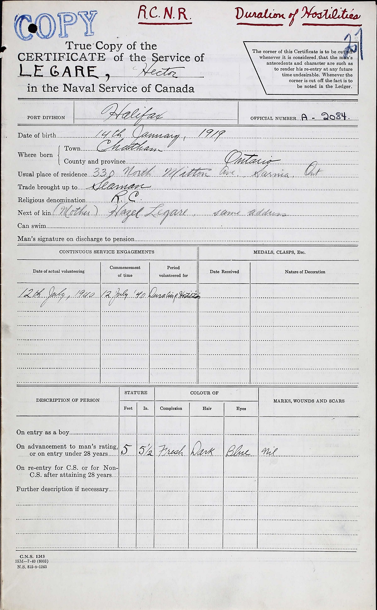 Ships served in: HMCS STADACONA - Enlisted 12 Jul 1940 as an AB, RCNR HMCS SAGUENAY - Drafted to SAGUENAY 04 Sep 1940 as an AB, RCNR