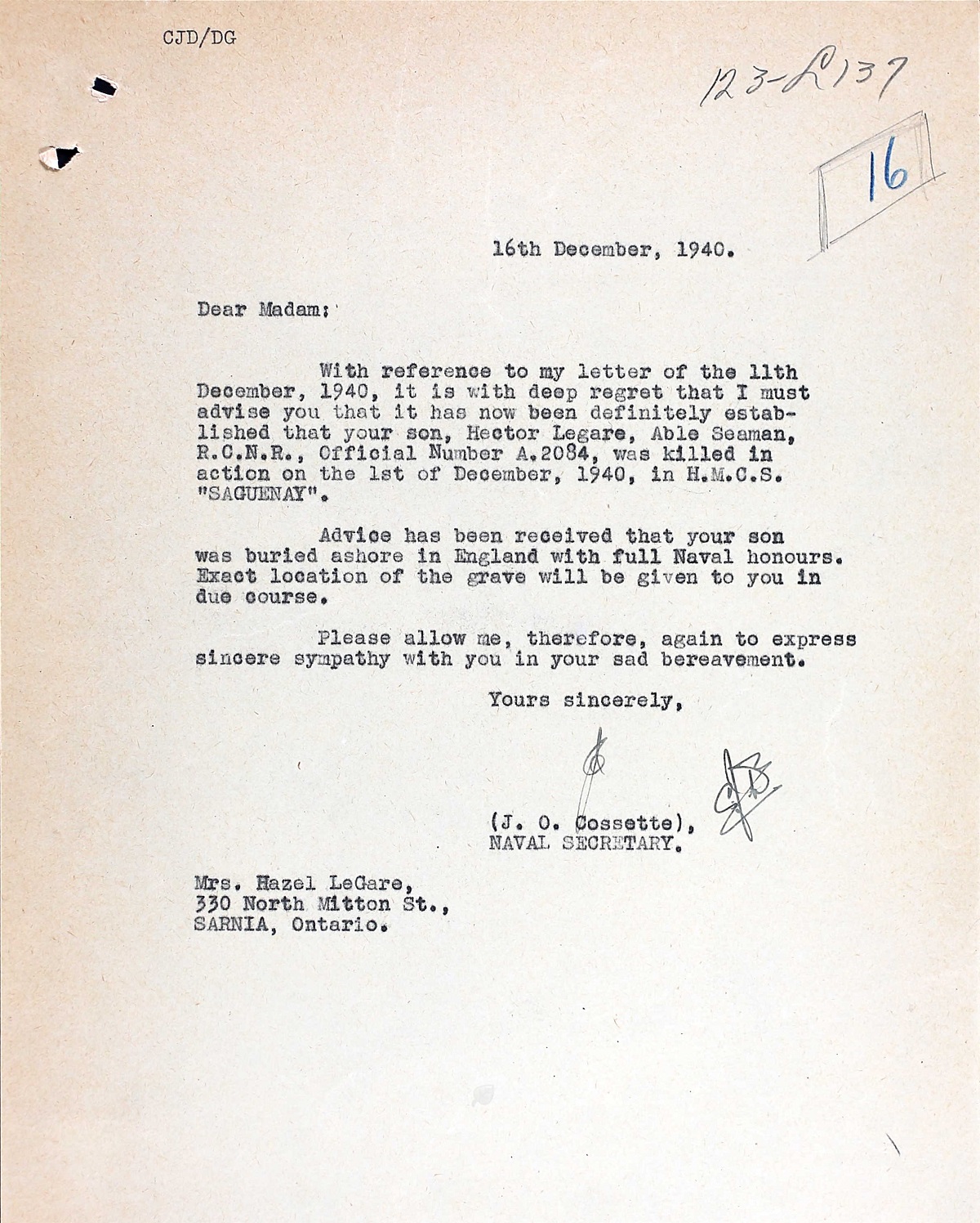 LE GARE, Hector, AB, A2084, RCNR, killed - 01 Dec 1940, HMCS SAGUENAY - Son of Hector O. Le Gare and Hazel D. Le Gare, of Toronto, Ontario.