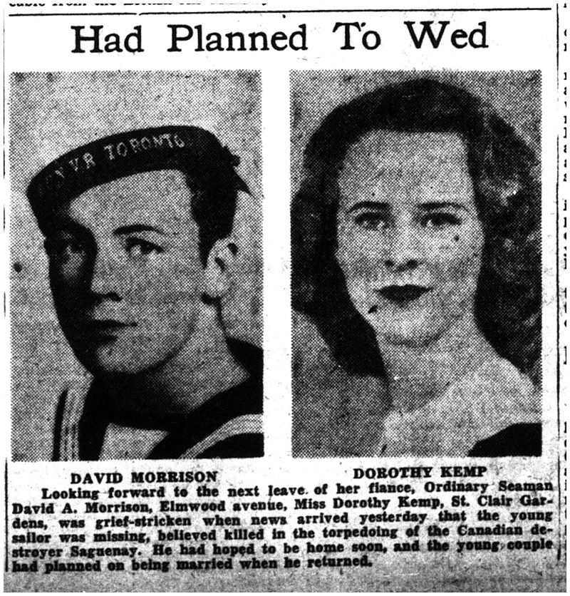 MORRISON, David Adamson, OS, V7587, RCNVR, killed - 01 Dec 1940, HMCS SAGUENAY - Son of David A. and Annie Morrison, of Toronto, Ontario.