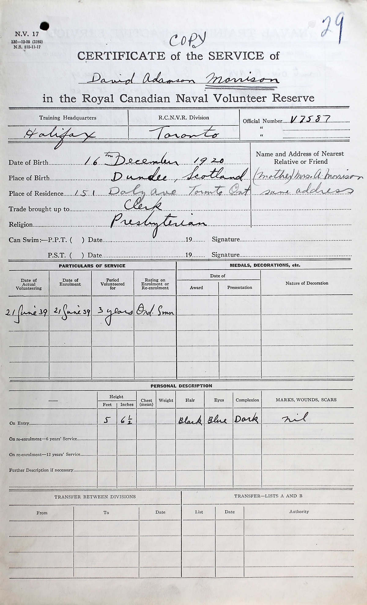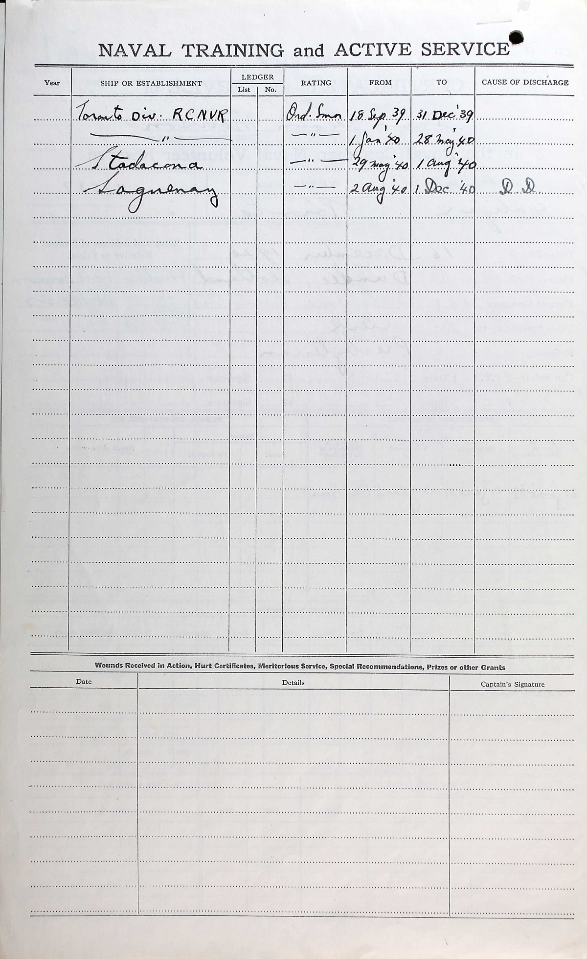 Ships served in: TORONTO DIVISION RCNVR - Enlisted 21 Jun 1939. Commenced Active Service 18 Sep 1939 HMCS STADACONA - Drafted to STADACONA 29 May 1940 as an OS, RCNVR HMCS SAGUENAY - Drafted to SAGUENAY 02 Aug 1940 as an OS, RCNVR