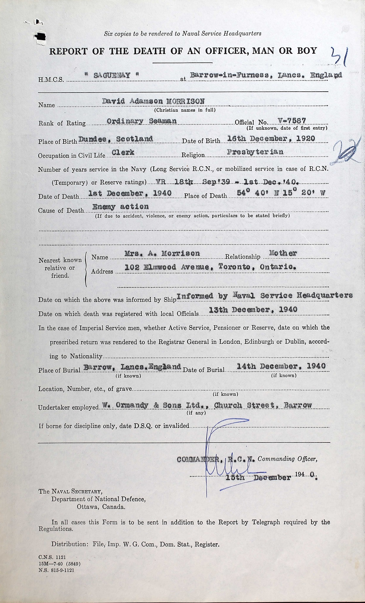 OS Morrison was killed when HMCS SAGUENAY, while escorting convoy HG.47, was torpedoed by the Italian submarine Argo 300 miles west of Ireland. With her bows wrecked and 21 dead, SAGUENAY made Barrow-in-Furness largely under her own power, and was under repairs until 22 May 1941. His body was recovered and he was buried in Barrow, Lancashire, England on 14 Dec 1940.