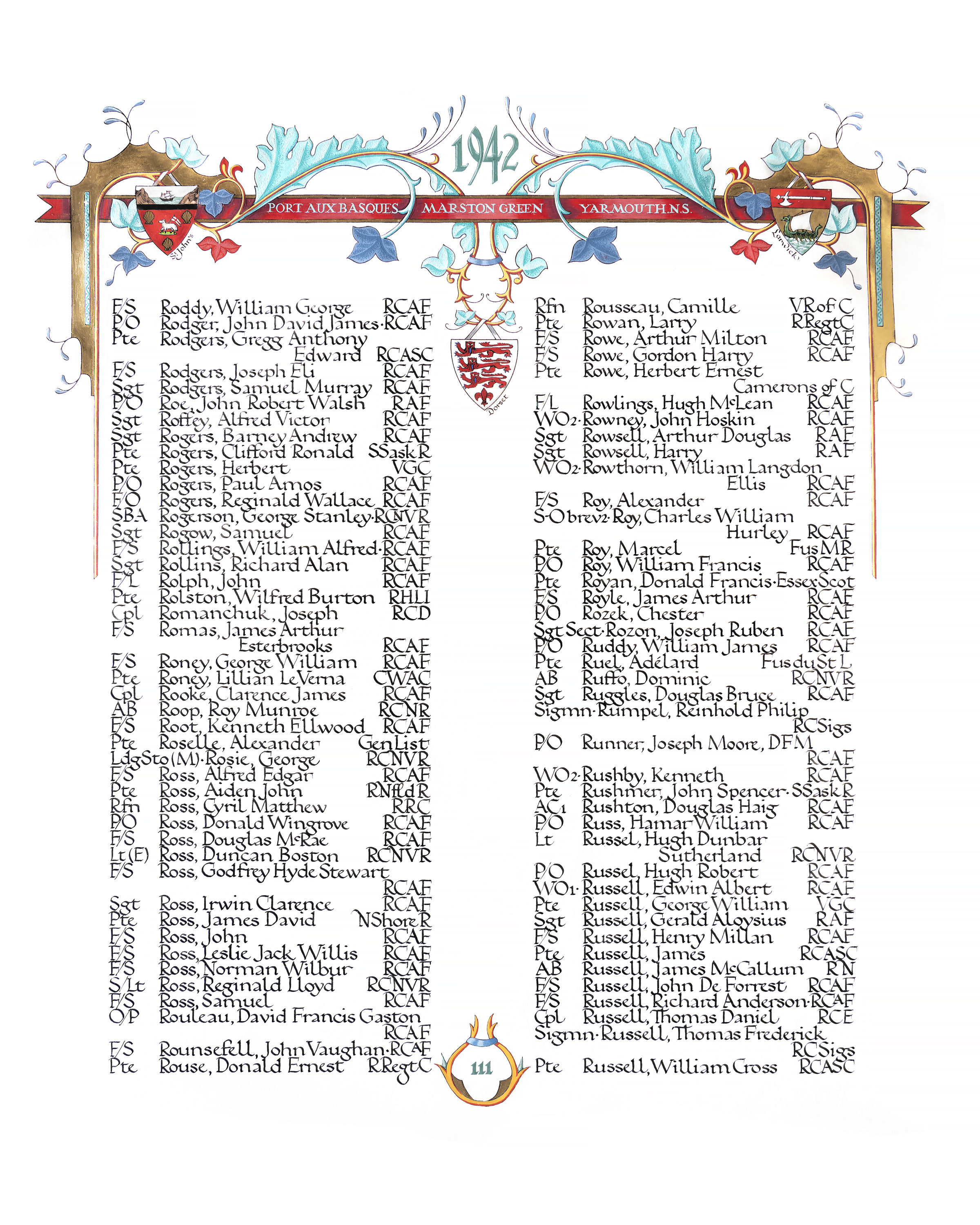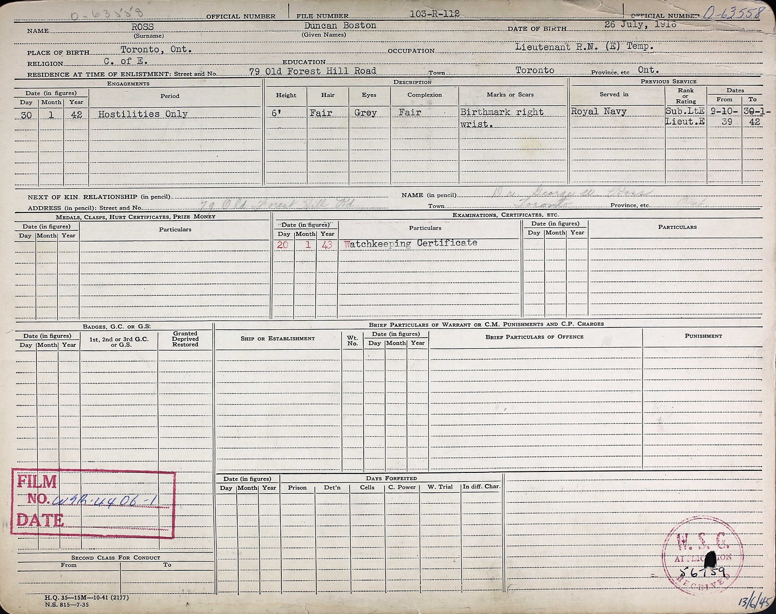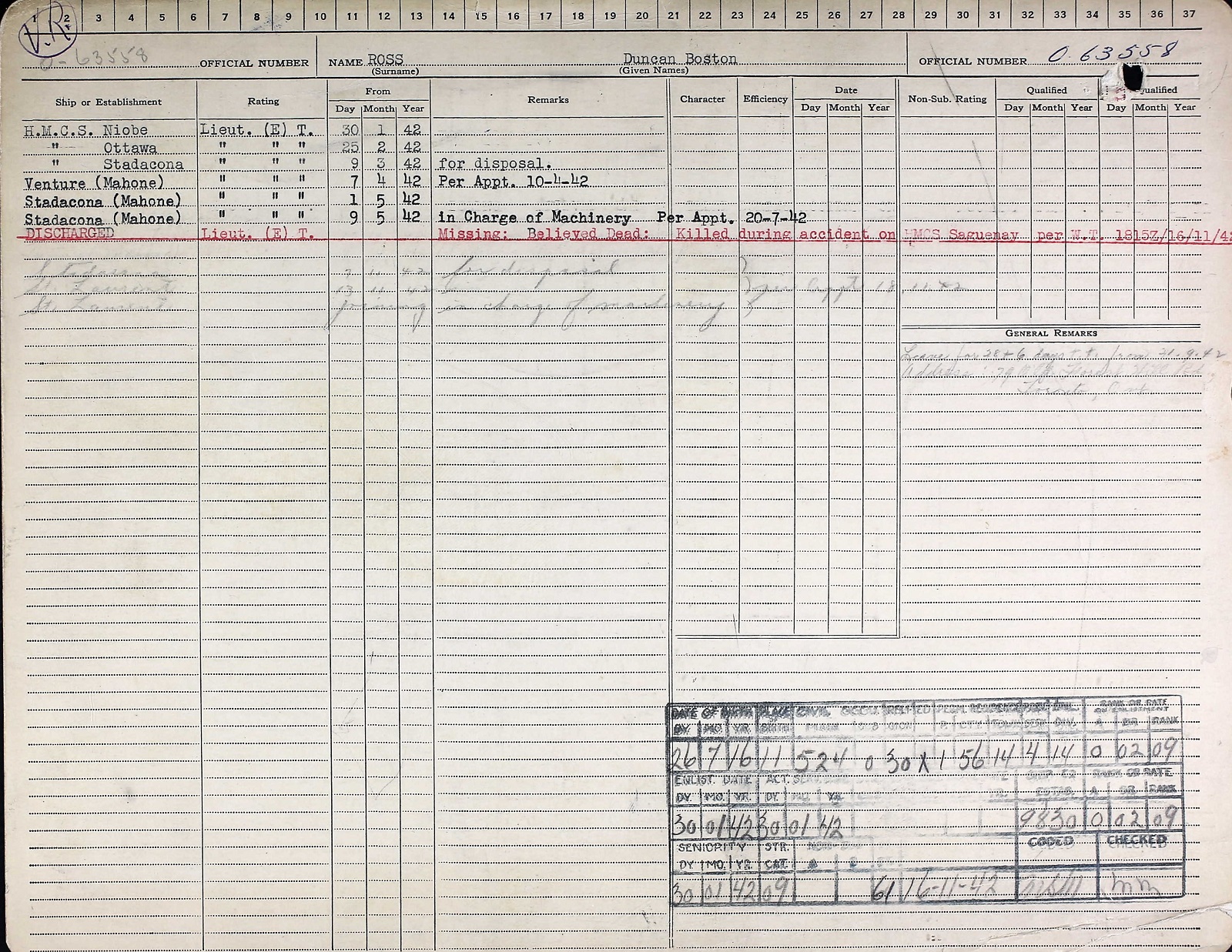 Ships served in: (Royal Canadian Navy) * Transferred to the RCNVR 30 Jan 1942 HMCS NIOBE - Appointed to NIOBE 30 Jan 1942 as a Lt (E), RCNVR HMCS OTTAWA - Served in OTTAWA 25 Feb 1942 - 08 Mar 1942 as a Lt (E), RCNVR HMCS MAHONE - Served in MAHONE 07 Apr 1942 - 06 Nov 1942 as a Lt (E), RCNVR HMCS STADACONA - Appointed to STADACONA 07 Nov 1942 as a Lt (E), RCNVR for disposal HMCS ST LAURENT - Appointed to ST LAURENT as add'l 13 Nov 1942 as a Lt (E), RCNVR, in charge of machinery. Appointment to commence of date of joining ship. HMCS SAGUENAY - Lt (E) Ross was onboard SAGUENAY for passage from Halifax to join ST LAURENT in St. John's, Nfld when he was killed