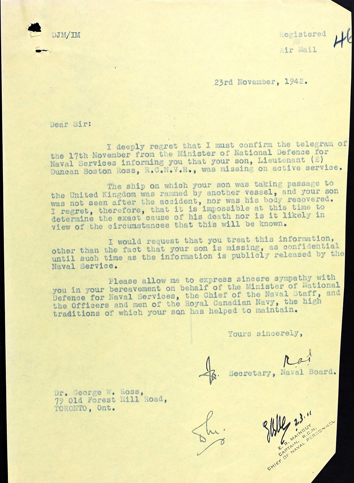 Lieutenant Ross was a passenger aboard HMCS SAGUENAY to join his ship HMCS ST LAURENT in St. John's, Newfoundland, when on November 15, 1942, SAGUENAY was rammed by the Panamanian freighter Azra off Cape Race, Newfoundland. The impact of the collision set off SAGUENAY'S depth charges, which blew off her stern. Lieutenant Ross was killed in this accident.