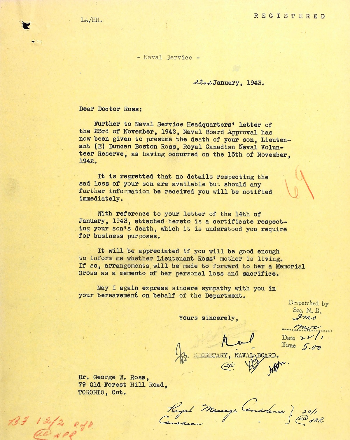 ROSS, Duncan Boston, Lt (E), RCNVR, MPK - 15 Nov 1942, HMCS SAGUENAY - Son of Dr. George W. Ross and Margaret W. Ross, of Toronto, Ontario.