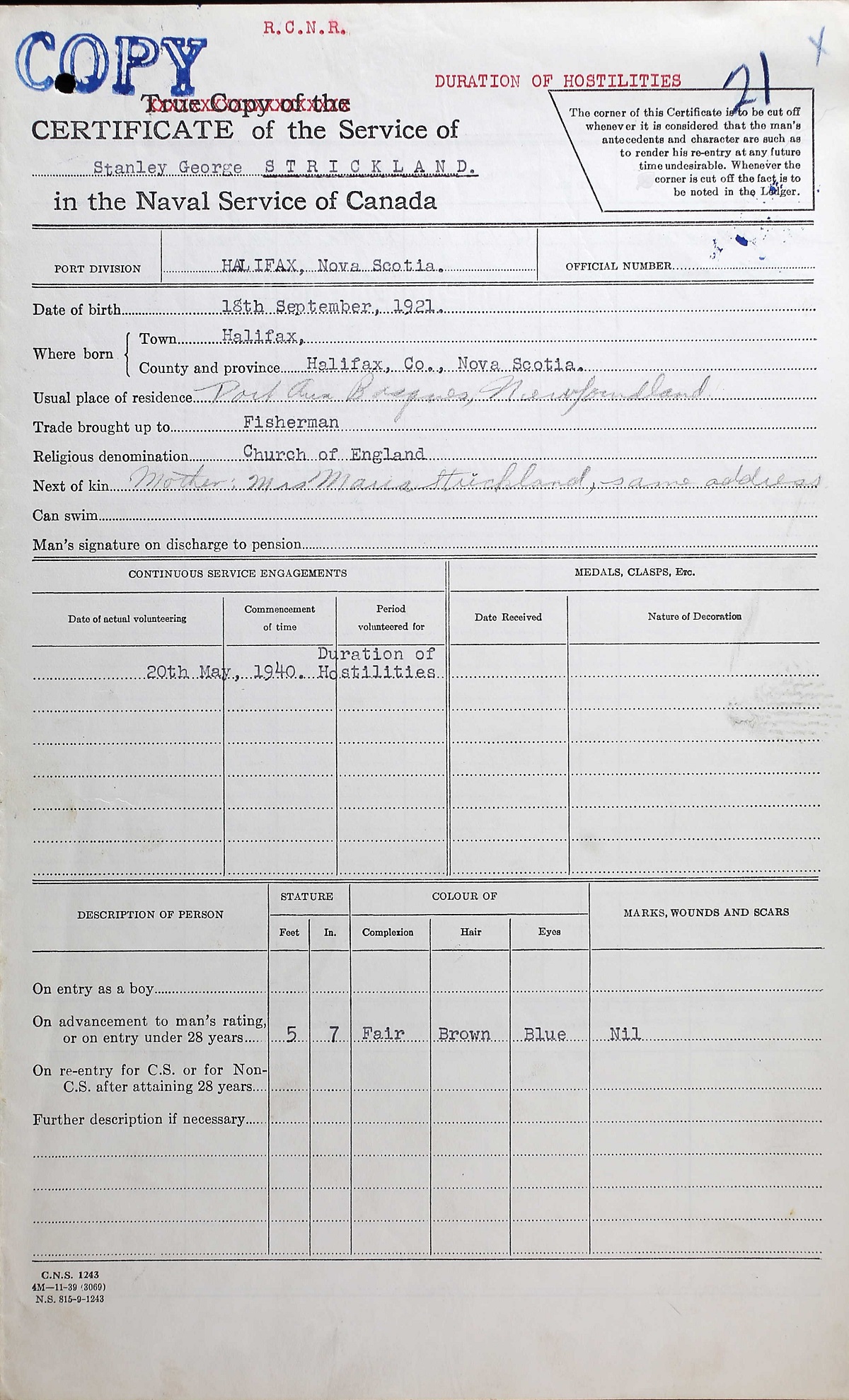 STRICKLAND, Stanley George, AB, A1657, RCNR, killed - 01 Dec 1940, HMCS SAGUENAY - Son of Cecil and Maria Strickland, of Port aux Basques, Newfoundland.