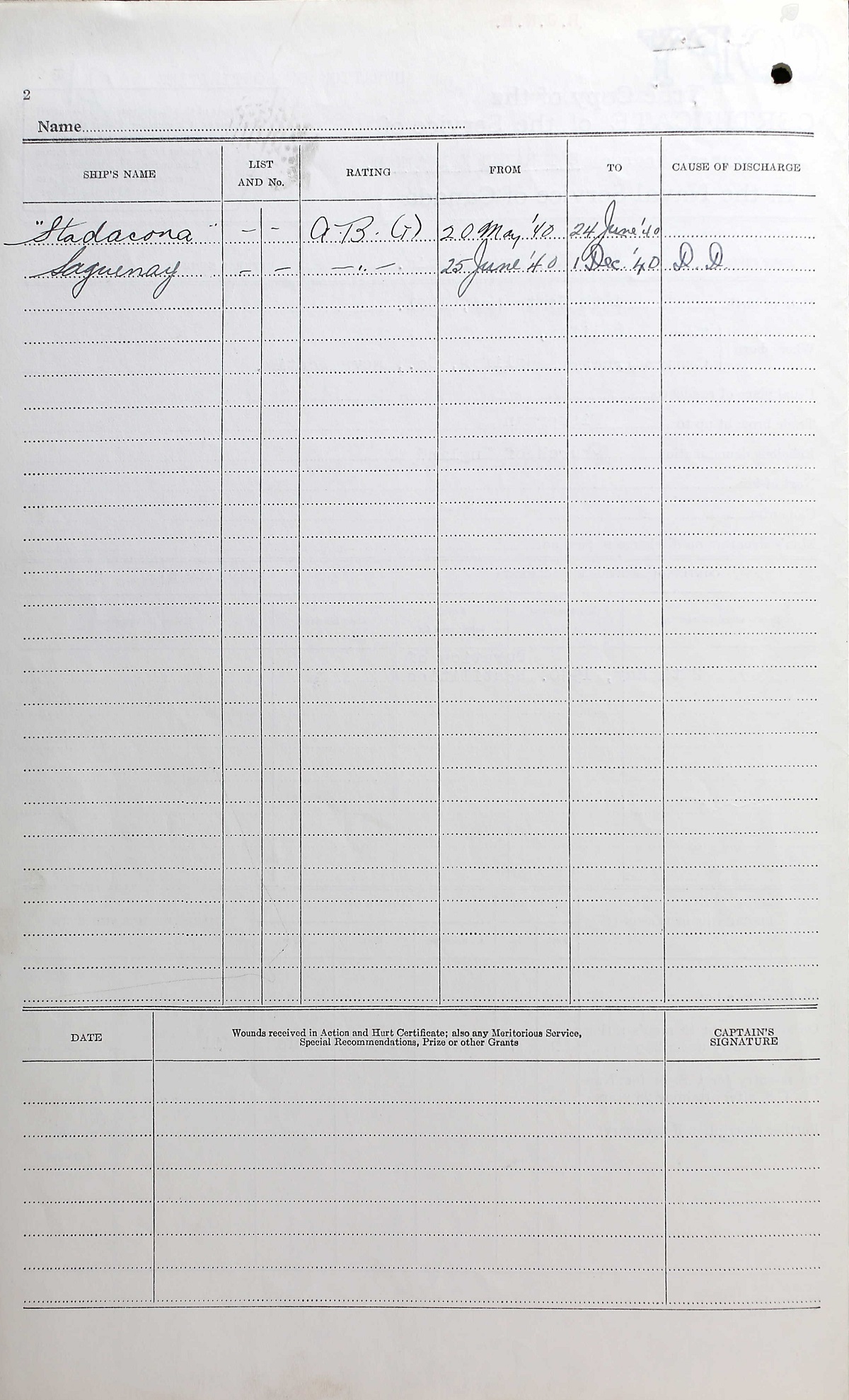 Ships served in: HMCS STADACONA - Enlisted 20 May 1940 as an AB, RCNR HMCS SAGUENAY - Drafted to SAGUENAY 26 Jun 1940 as an AB, RCNR
