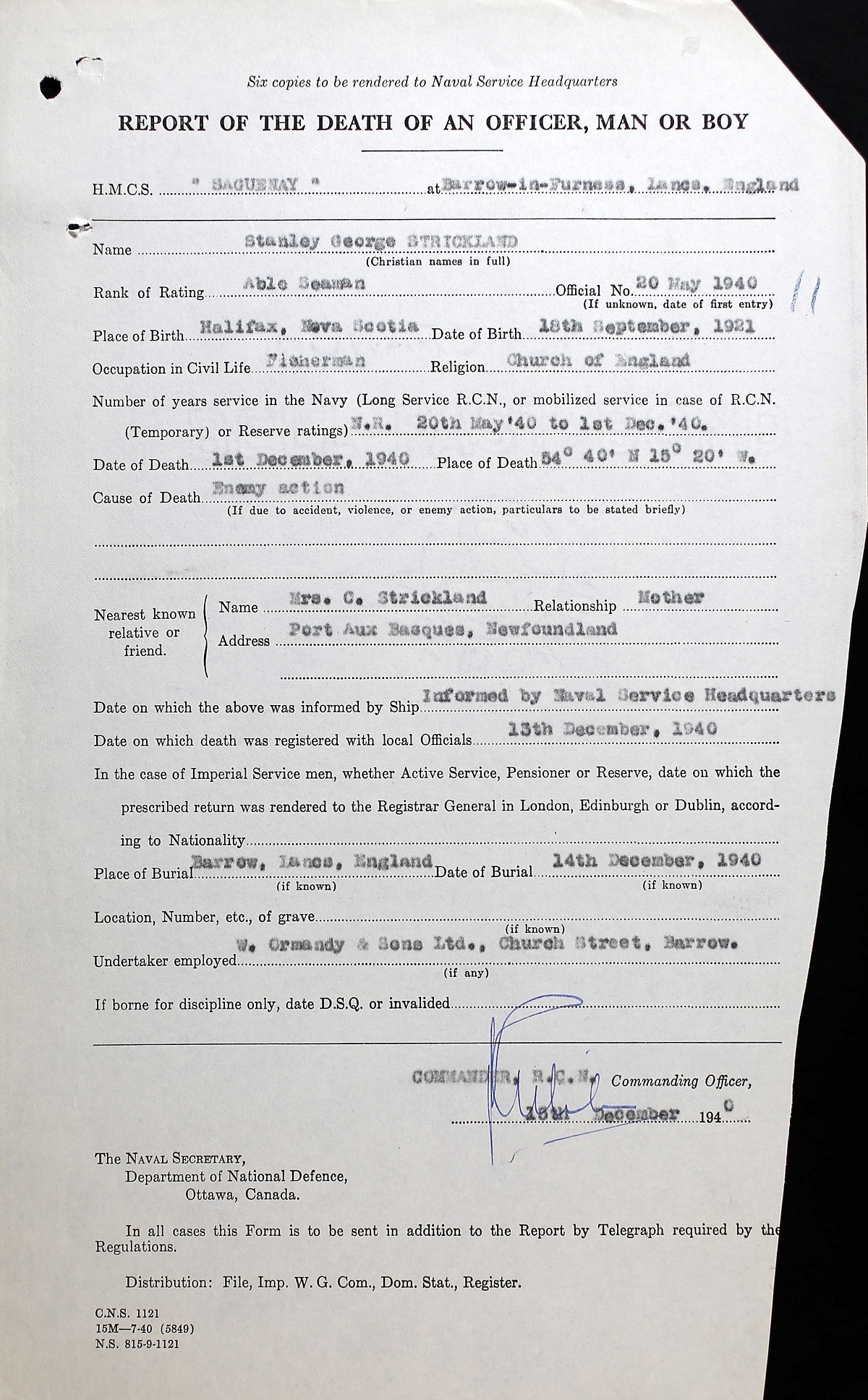 AB Strickland was killed when HMCS SAGUENAY, while escorting convoy HG.47, was torpedoed by the Italian submarine Argo 300 miles west of Ireland. With her bows wrecked and 21 dead, SAGUENAY made Barrow-in-Furness largely under her own power, and was under repairs until 22 May 1941. His body was recovered and he was buried in Barrow, Lancashire, England on 14 Dec 1940.