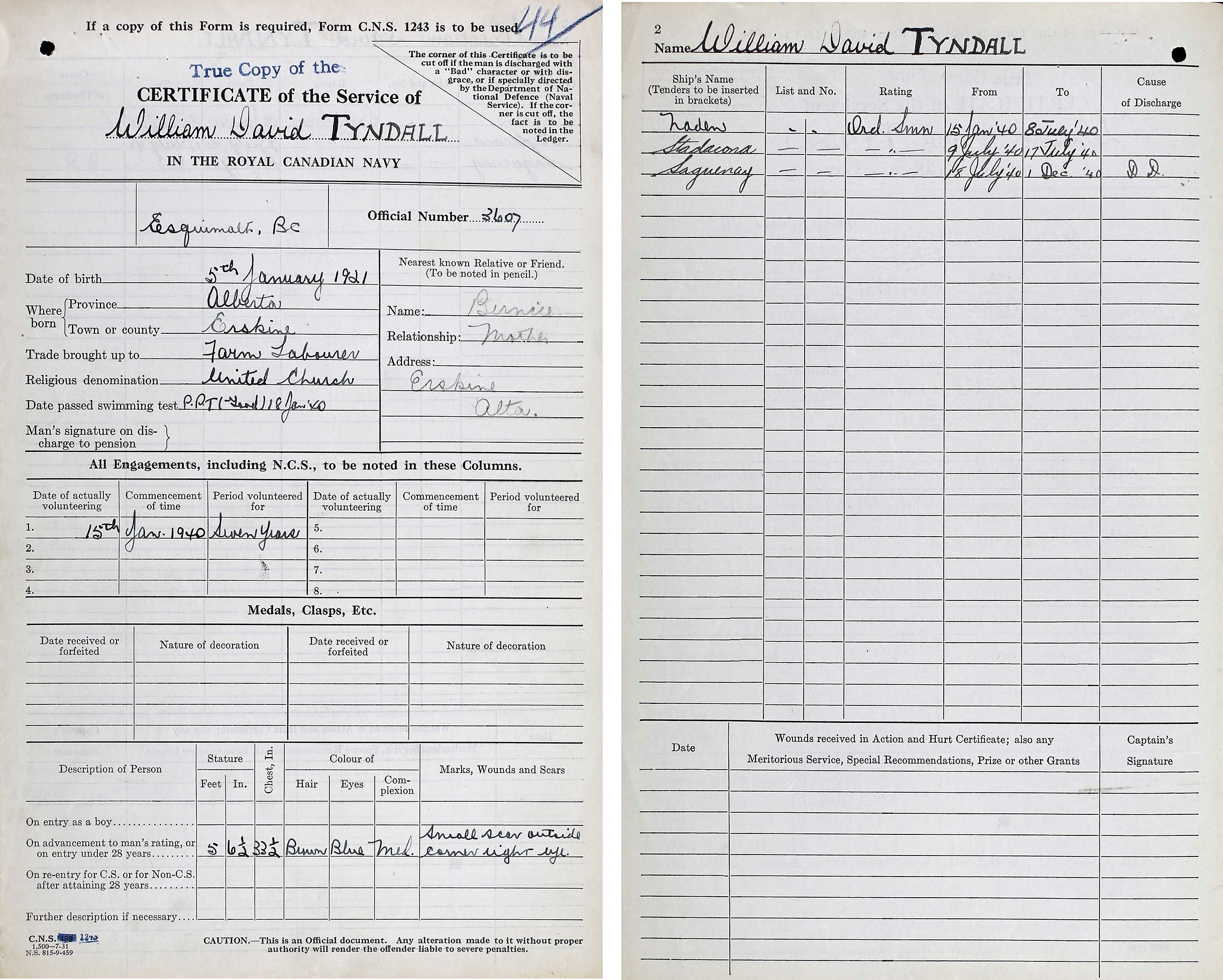 TYNDALL, William David, OS, 3607, RCN, killed - 01 Dec 1940, HMCS SAGUENAY - Son of Edward Gordon Tyndall and Bernice C. Tyndall, of Erksine, Alberta.