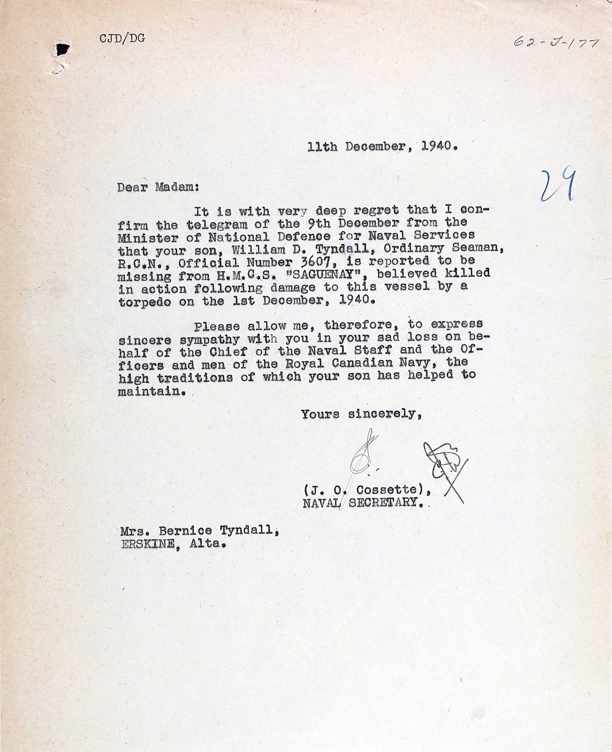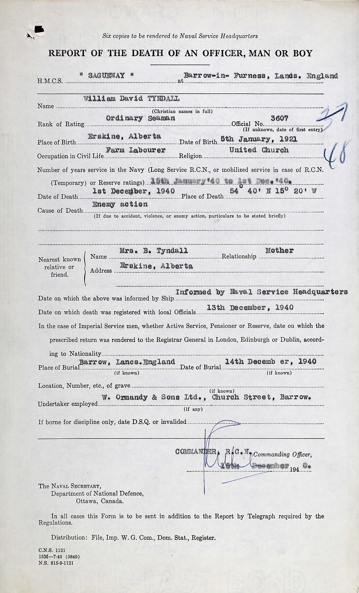 OS Tyndall was killed when HMCS SAGUENAY, while escorting convoy HG.47, was torpedoed by the Italian submarine Argo 300 miles west of Ireland. With her bows wrecked and 21 dead, SAGUENAY made Barrow-in-Furness largely under her own power, and was under repairs until 22 May 1941. His body was recovered and he was buried in Barrow, Lancashire, England on 14 Dec 1940.