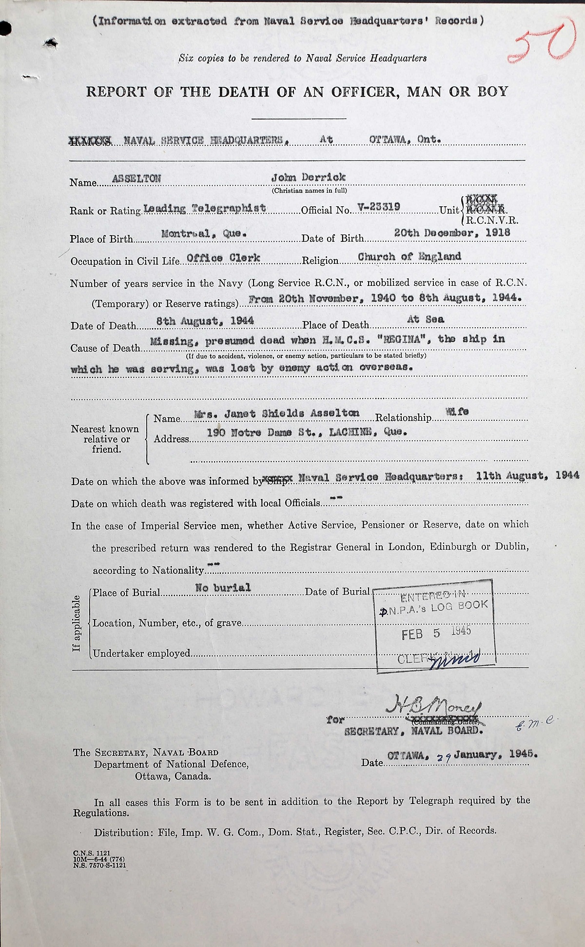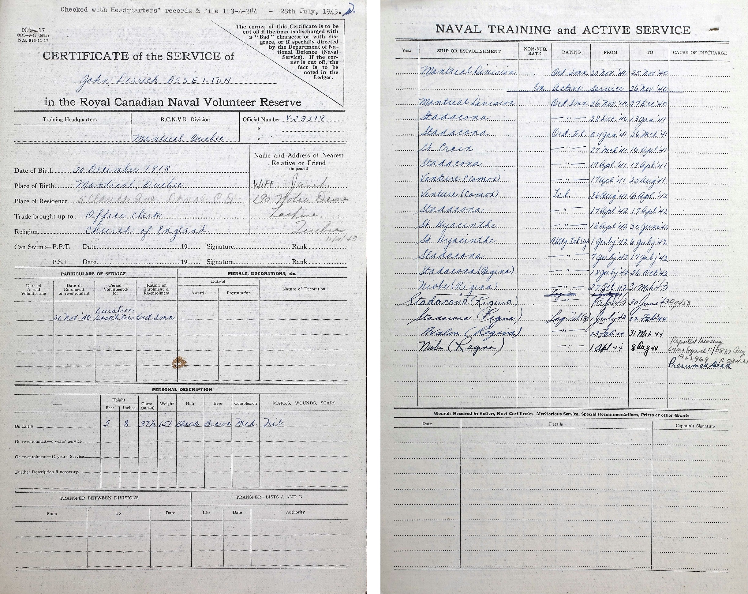 L/Tel Asselton died when HMCS REGINA was torpedoed and sunk off Trevose Head, Cornwall, England by U-667 while she was aiding a merchant vessel in distress. Thirty of her crew were lost.