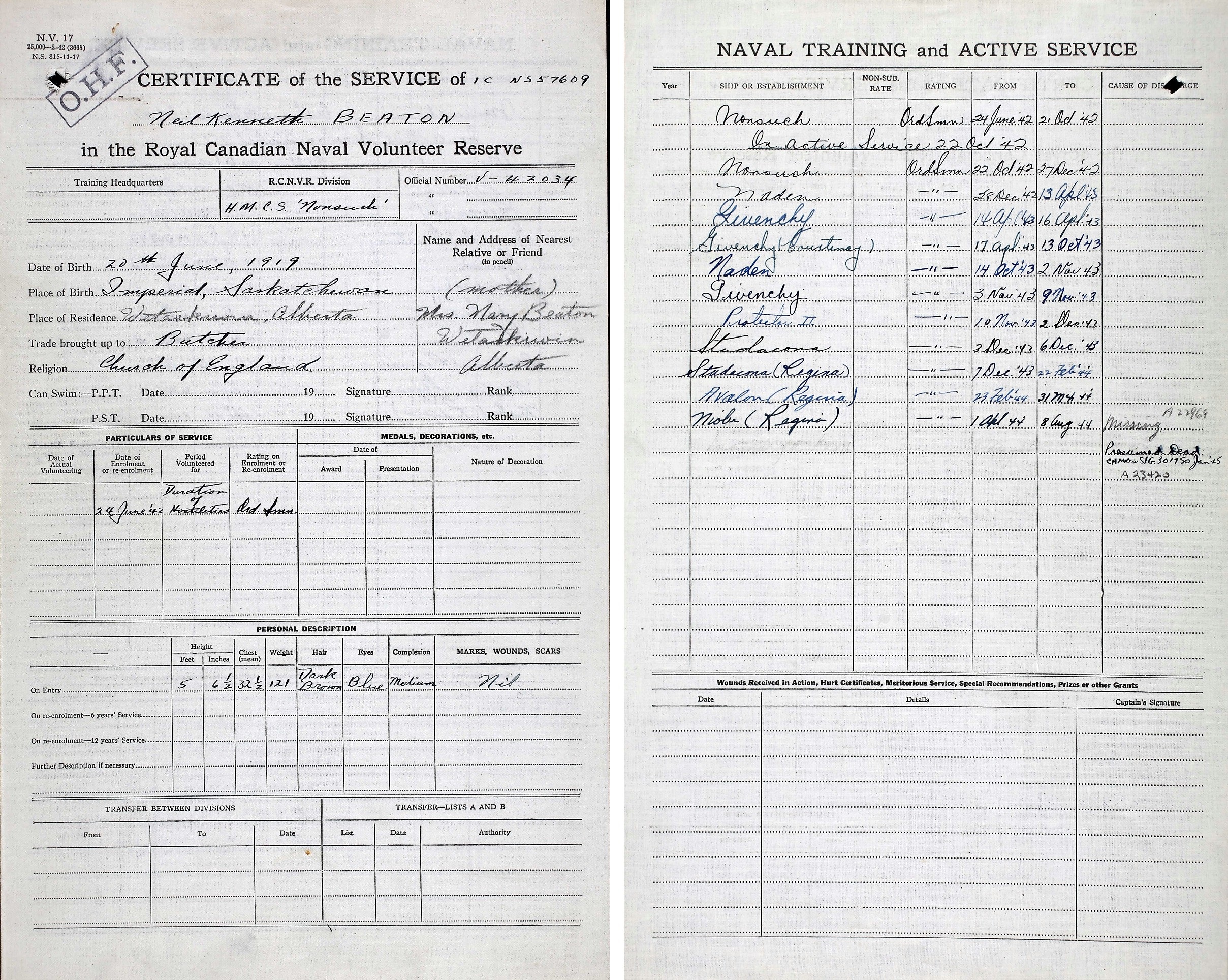 Ships served in: HMCS NONSUCH - Enlisted 24 Jun 1942. Commenced Active Service 22 Oct 1942 HMCS NADEN - Drafted to NADEN 28 Dec 1942 as an OS, RCNVR * Rated Prob. SD 10 Apr 1943 HMCS GIVENCHY - Drafted to GIVENCHY 14 Apr 1943 as an OS, RCNVR HMCS COURTENAY - Served in COURTENAY 17 Apr 1943 - 13 Oct 1943 as an OS, RCNVR HMCS NADEN - Drafted to NADEN 14 Oct 1943 as an OS, RCNVR * Rated SD 16 Aug 1943 HMCS GIVENCHY - Drafted to GIVENCHY 03 Nov 1943 (for passage to east coast) HMCS PROTECTEUR II - Drafted to PROTECTEUR II 10 Nov 1943 as an OS, RCNVR HMCS STADACONA - Drafted to STADACONA 03 Dec 1943 as an OS, RCNVR HMCS REGINA - Drafted to REGINA 07 Dec 1943 as an OS, RCNVR