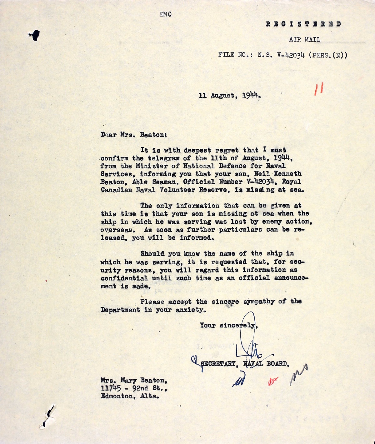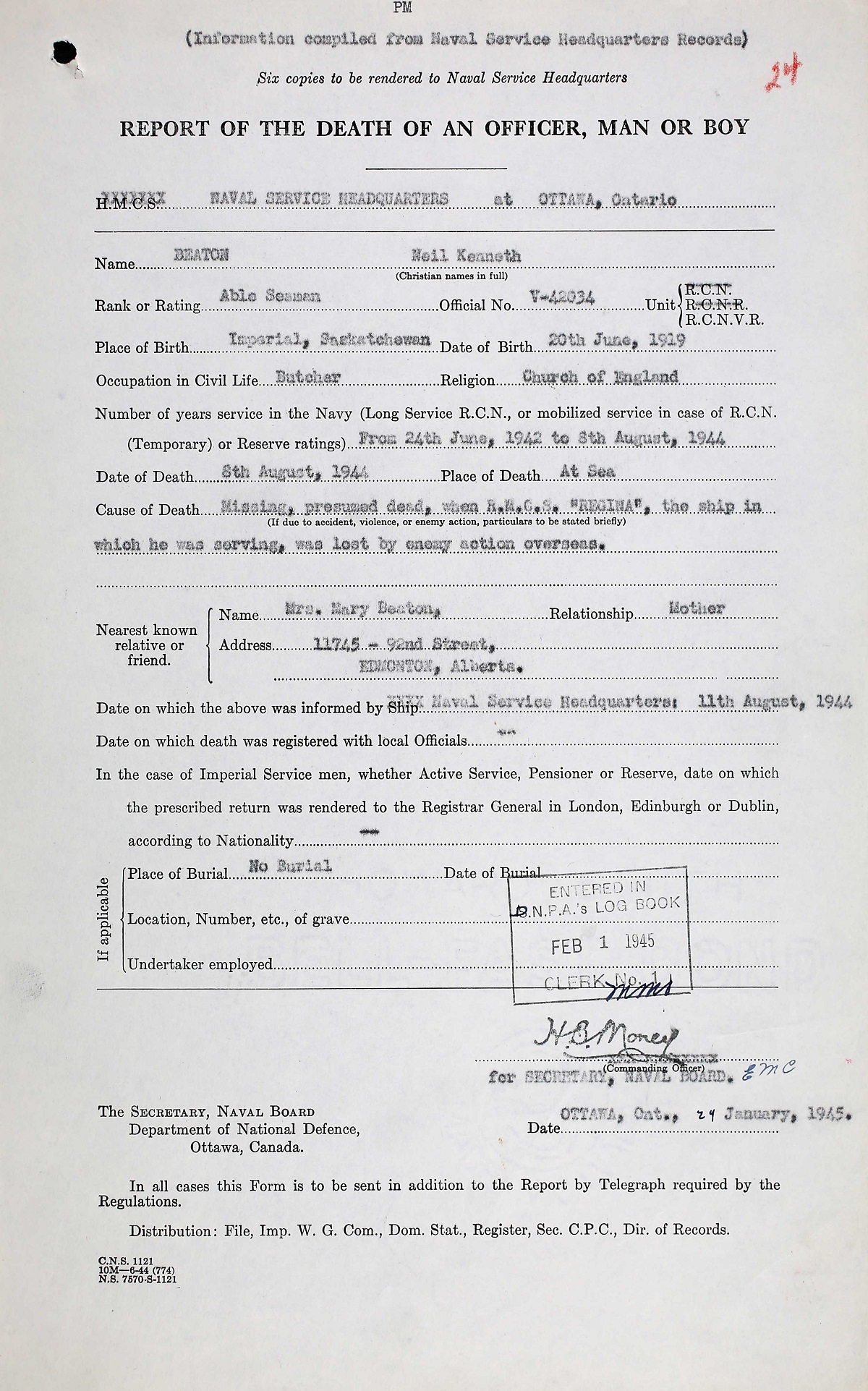 BEATON, Neil Kenneth, AB, V42034, RCNVR, MPK - 08 Aug 1944, HMCS REGINA - Son of Henry M. and Mary E. Beaton, of Edmonton, Alberta.
