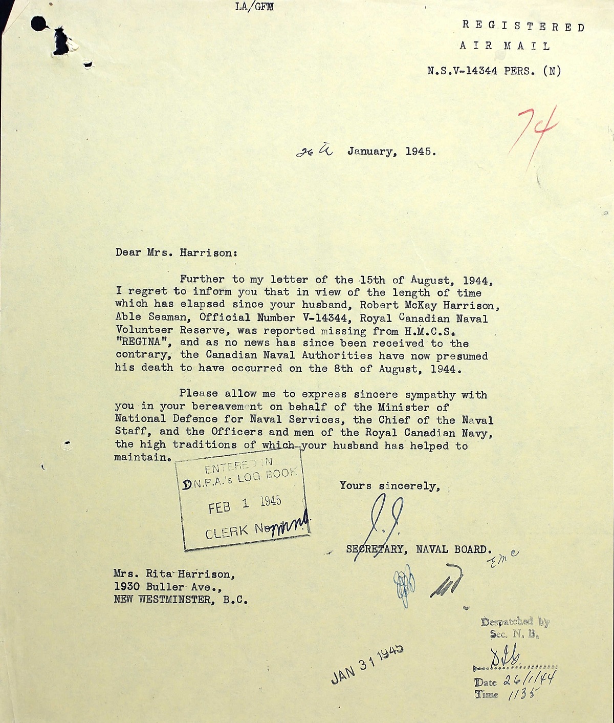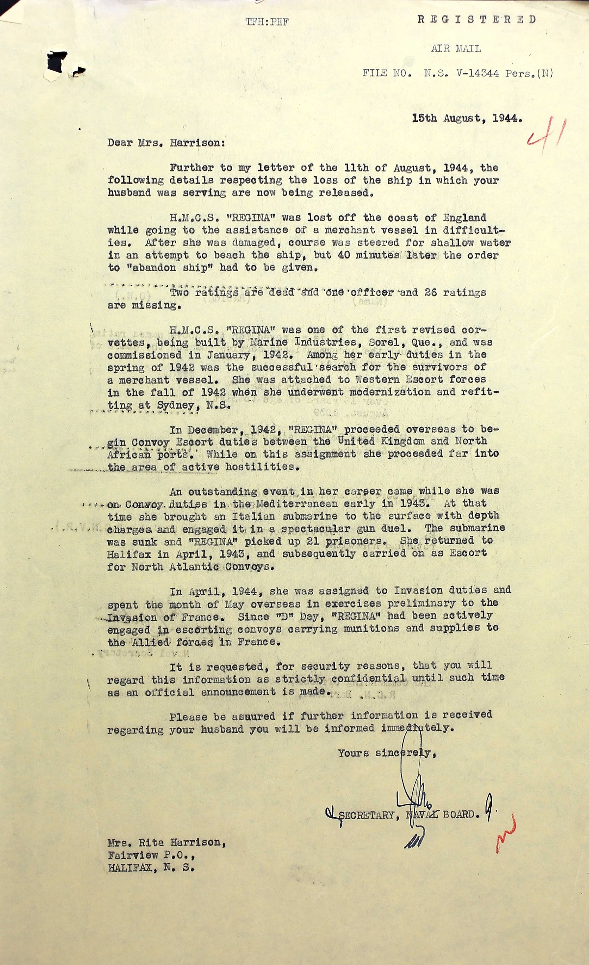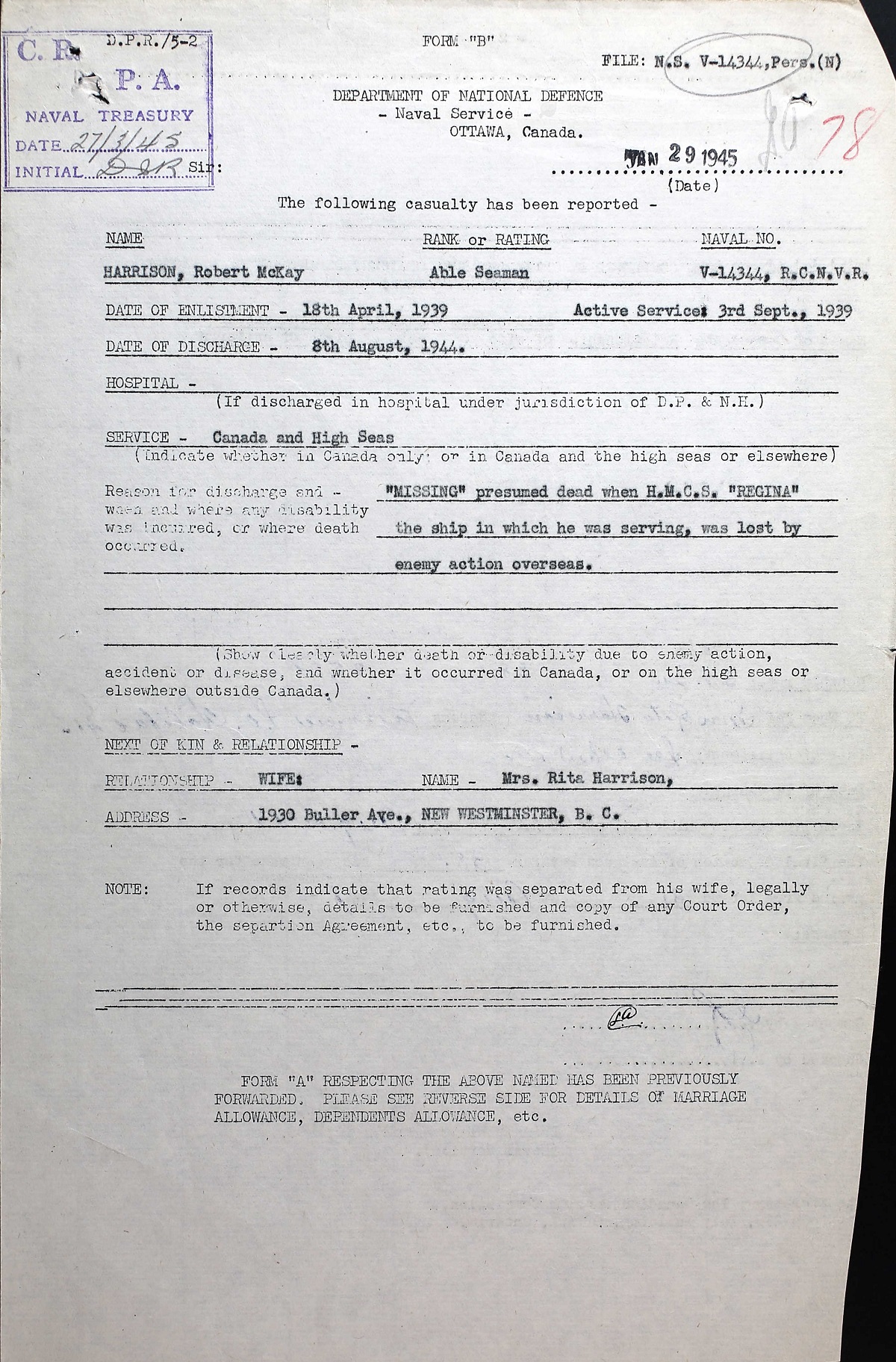 AB Harrison died when HMCS REGINA was torpedoed and sunk off Trevose Head, Cornwall, England by U-667 while she was aiding a merchant vessel in distress. Thirty of her crew were lost.