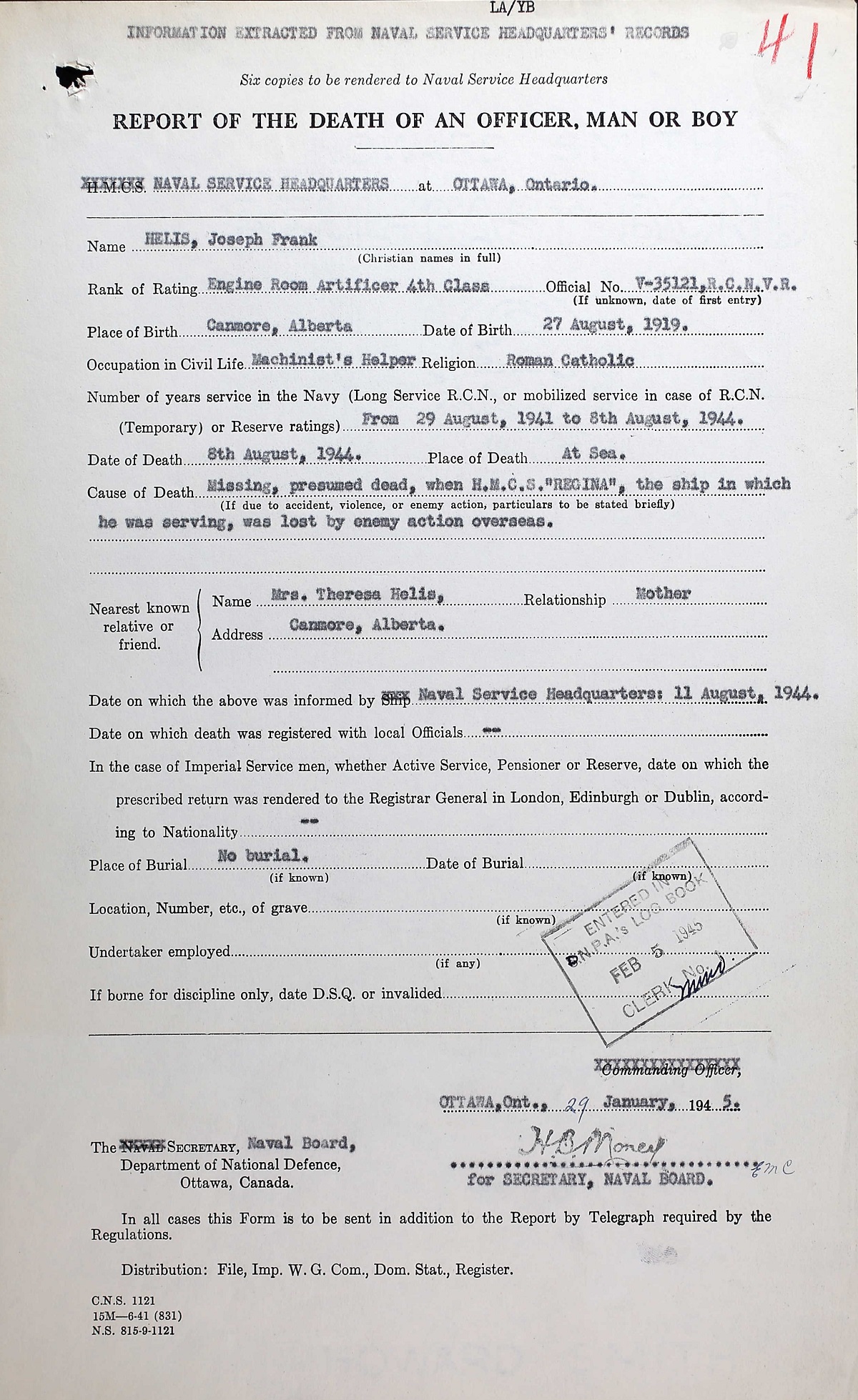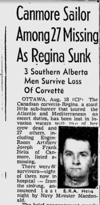 HELIS, Joseph Frank, ERA, V35121, RCNVR, MPK - 08 Aug 1944, HMCS REGINA - Son of Joseph and Theresa Helis, of Canmore, Alberta. Prior to enlisting in the Navy, Joseph Helis served in the 2nd Battalion Calgary Highlanders, (Reserve) from 25 Jul 1940 to 28 Aug 1941.