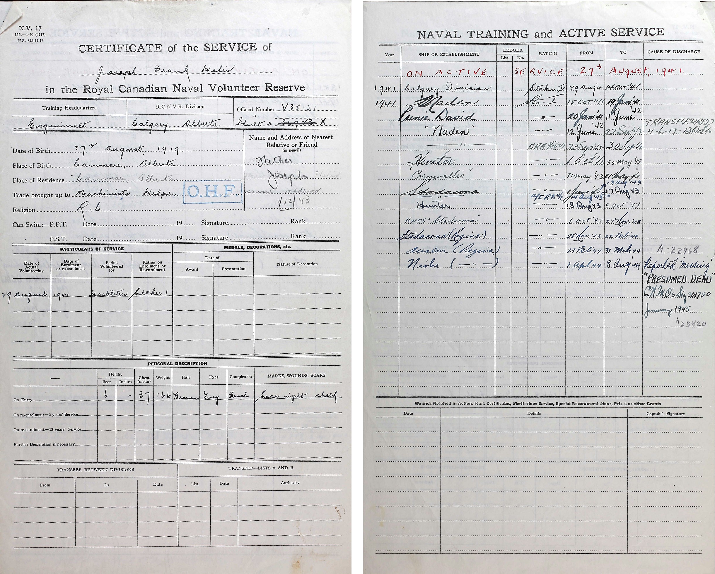 Ships served in: CALGARY DIVISION RCNVR - Enlisted / Commenced Active Service 29 Aug 1941 as a Sto 1c, RCNVR HMCS NADEN - Drafted to NADEN 15 Dec 1941 as a Sto 1c, RCNVR HMCS PRINCE DAVID - Drafted to PRINCE DAVID 20 Jan 1941 as a Sto 1c, RCNVR HMCS NADEN - Drafted to NADEN 12 Jun 1942 as a Sto 1c, RCNVR * Trade transfer to ERA 5c, RCNVR 23 Sep 1942 HMCS HUNTER - Drafted to HUNTER 01 Oct 1942 as an ERA 5c, RCNVR HMCS CORNWALLIS - Drafted to CORNWALLIS 31 May 1943 as an ERA 5c HMCS STADACONA - Drafted to STADACONA 01 Jun 1943 as an ERA 5c, RCNVR * Rated ERA 4c 14 Aug 1943 HMCS HUNTER - Drafted to HUNTER 18 Aug 1943 as an ERA 4c, RCNVR HMCS STADACONA - Drafted to STADACONA 06 Oct 1943 as an ERA 4c, RCNVR HMCS REGINA - Drafted to REGINA 28 Nov 1943 as an ERA 4c, RCNVR
