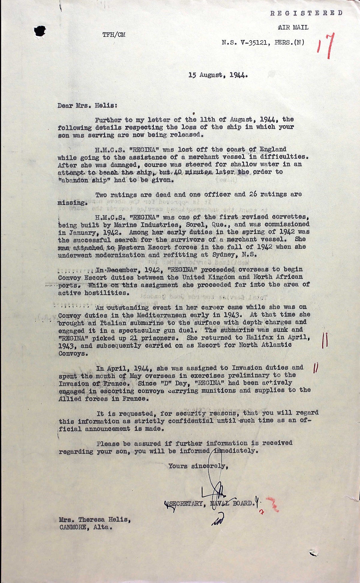 ERA Helis died when HMCS REGINA was torpedoed and sunk off Trevose Head, Cornwall, England by U-667 while she was aiding a merchant vessel in distress. Thirty of her crew were lost.
