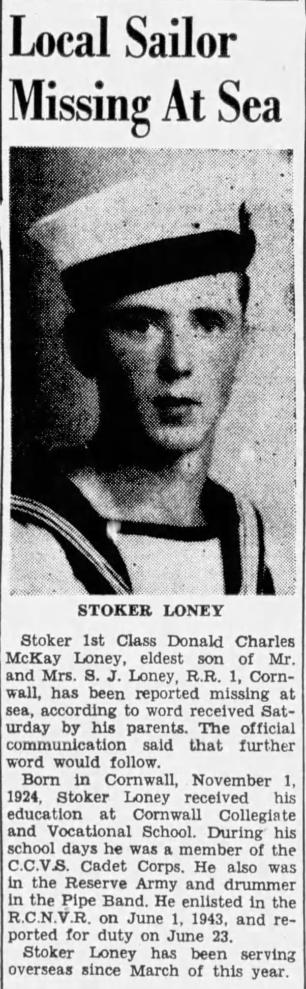(DL01) Stoker Donald Loney Missing at sea // The Cornwall Daily Standard Freeholder 15 Aug 1944 (DL02) Documents from the Service File of Donald Loney