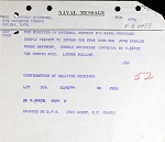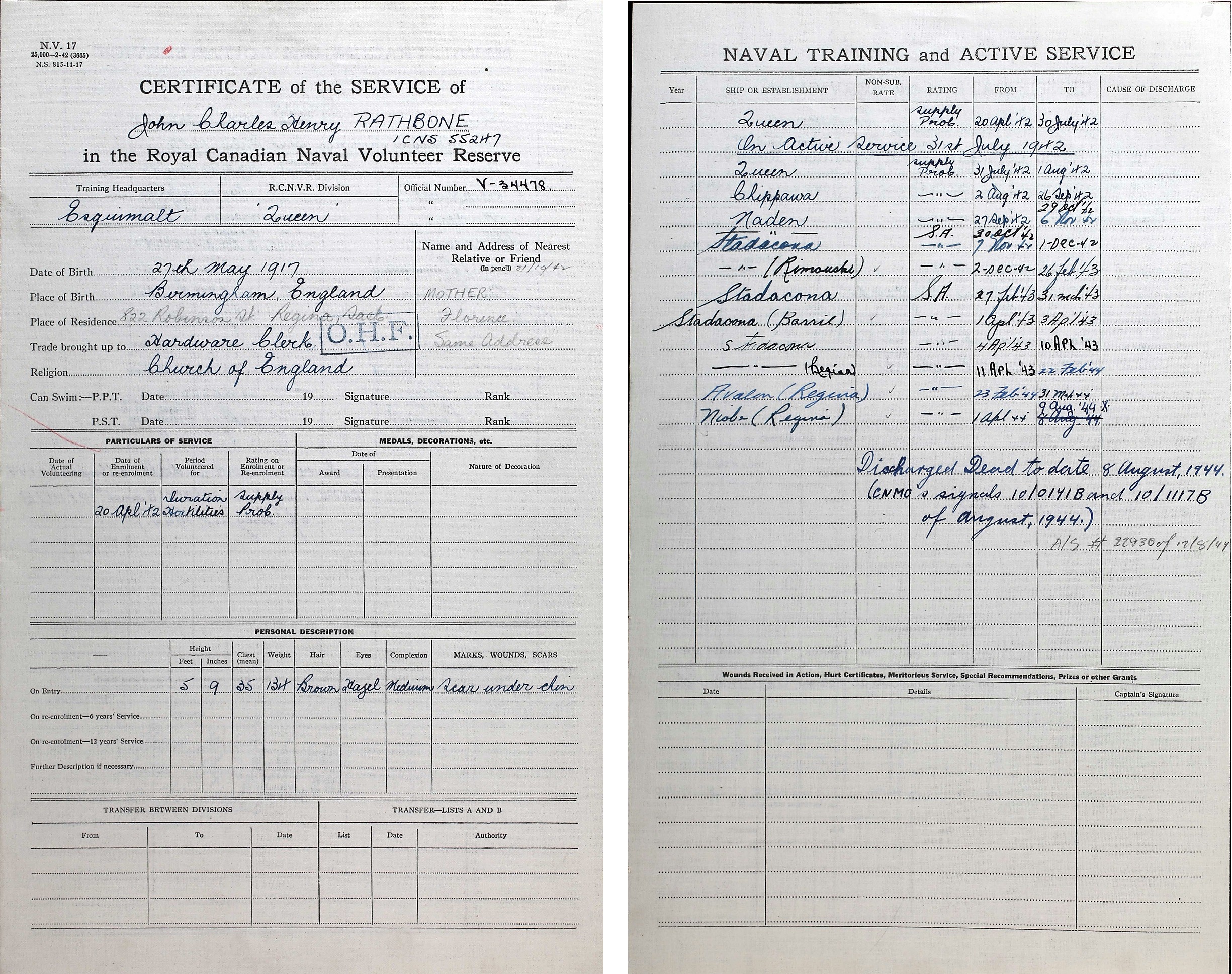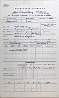 Ships served in: HMCS QUEEN - Enlisted 20 Apr 1942 as a Prob. SA, RCNVR. Commenced Active Service 31 Jul 1942. HMCS CHIPPAWA - Drafted to CHIPPAWA 02 Aug 1942 as Prob. SA, RCNVR HMCS NADEN - Drafted to NADEN 27 Sep 1942 as a Prob. SA, RCNVR for SA Technical Course * Rated SA 30 Oct 1942 HMCS STADACONA - Drafted to STADACONA 07 Nov 1942 as a SA, RCNVR HMCS RIMOUSKI - Drafted to RIMOUSKI 02 Dec 1942 as a SA, RCNVR HMCS STADACONA - Drafted to STADACONA 27 Feb 1943 as a SA, RCNVR HMCS BARRIE - Drafted to BARRIE 01 Apr 1943 as a SA, RCNVR HMCS STADACONA - Drafted to STADACONA 04 Apr 1943 as a SA, RCNVR HMCS REGINA - Drafted to REGINA 23 Feb 1944 as a SA, RCNVR