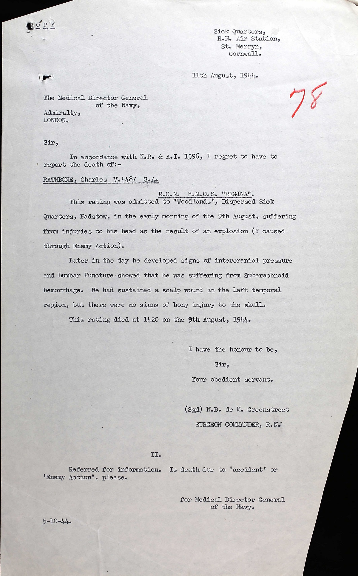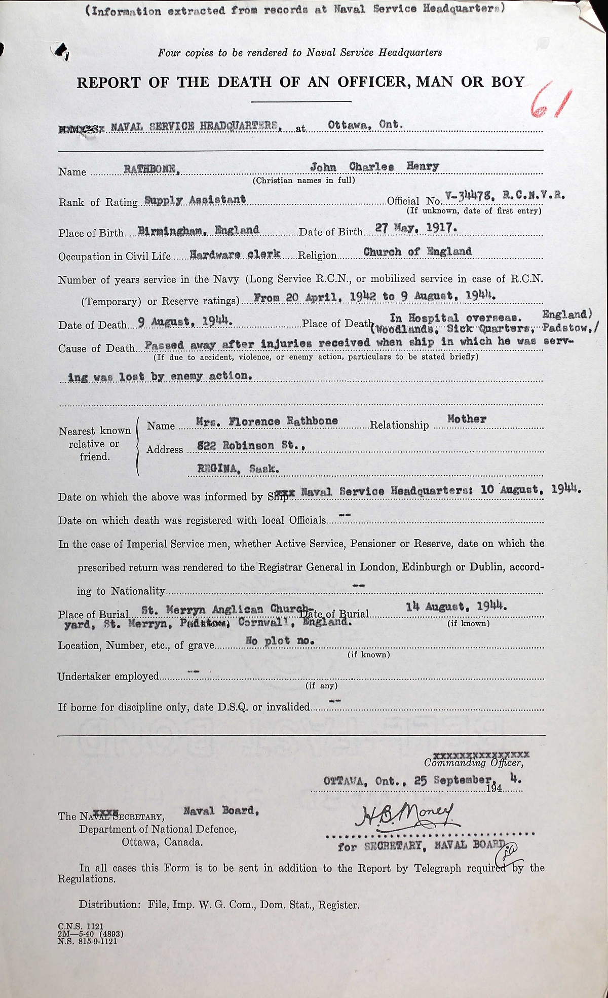 SA Rathbone died from injuries received during the torpedoing and sinking of HMCS REGINA. HMCS REGINA was lost 08 Aug 1944, when she was torpedoed off Trevose Head, Cornwall, by U-667 while going to the assistance of a merchant vessel in difficulties. Thirty of her crew were lost. SA Rathbone is buried in the St. Merryn Churchyard, Cornwall, England.