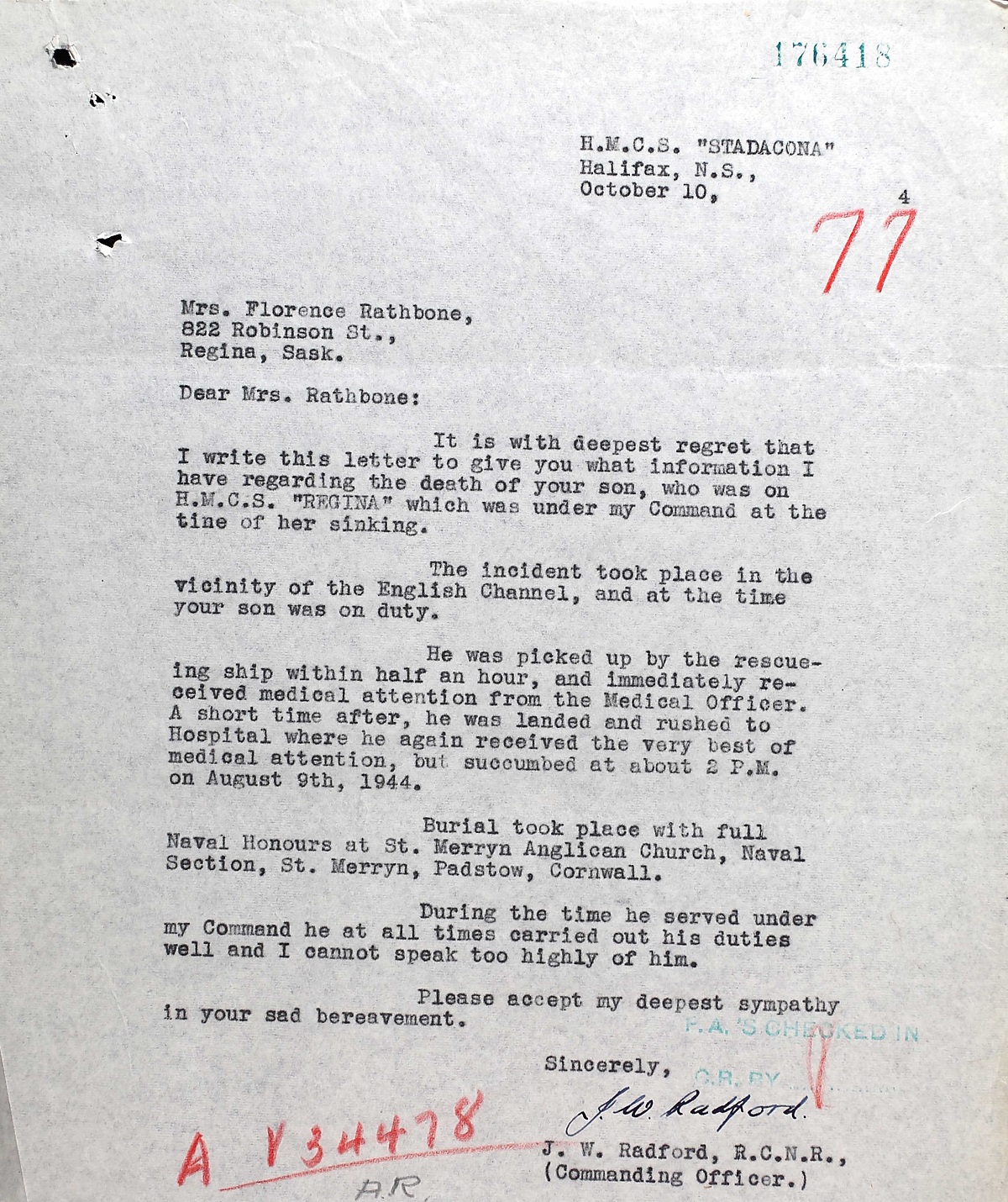 RATHBONE, John Charles Henry, SA, V34478, RCNVR, DOW - 09 Aug 1944, HMCS REGINA - Son of John Rathbone, and of Florence Rathbone, of Regina, Saskatchewan, Canada.