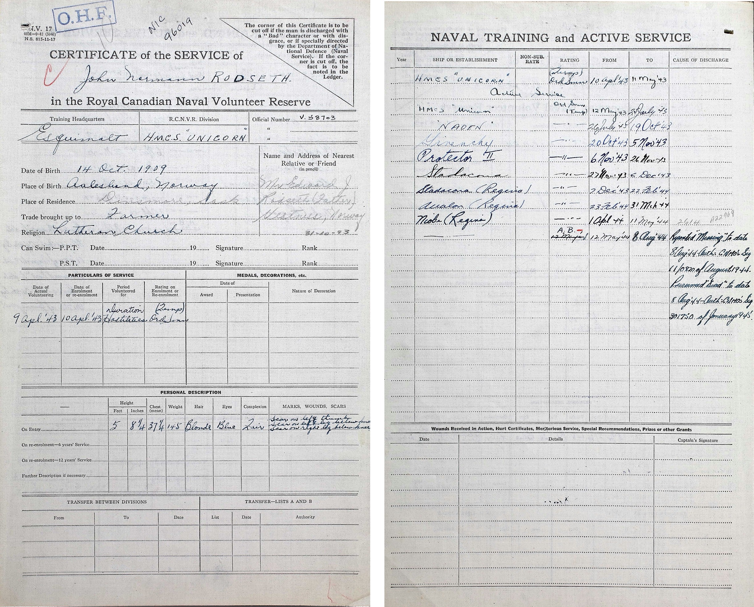Ships served in: HMCS UNICORN - Enlisted 10 Apr 1943. Commenced Active Service 12 May 1943 as an OS, RCNVR HMCS NADEN - Drafted to NADEN 26 Jul 1943 as an OS, RCNVR HMCS GIVENCHY - Drafted to GIVENCHY 20 Oct 1943 as an OS, RCNVR HMCS PROTECTOR II - Drafted to PROTECTOR II 06 Nov 1943 as an OS, RCNVR HMCS STADACONA - Drafted to STADACONA 27 Nov 1943 as an OS, RCNVR HMCS REGINA - Drafted to REGINA 07 Dec 1943 as an OS, RCNVR * Rated AB 12 May 1944