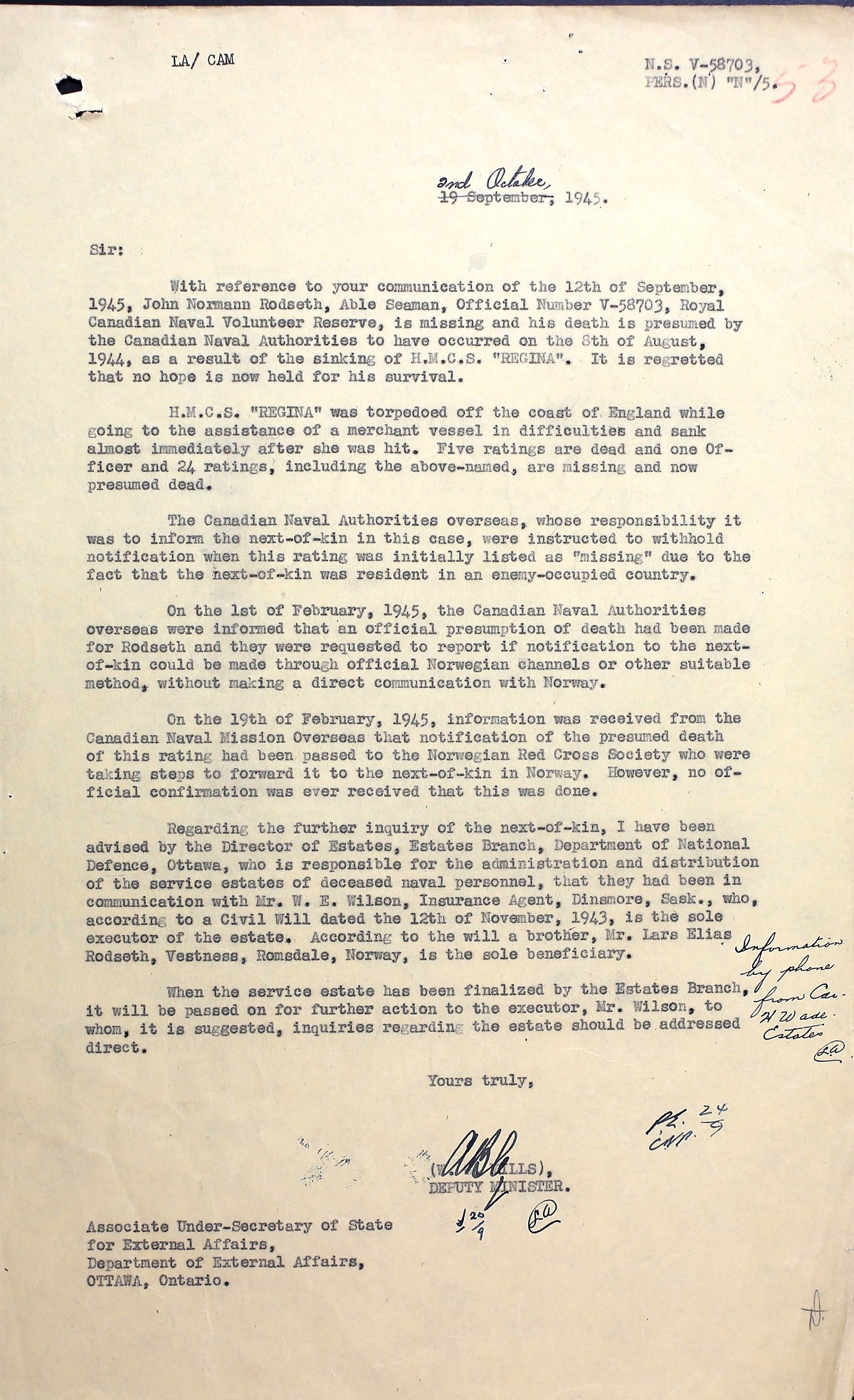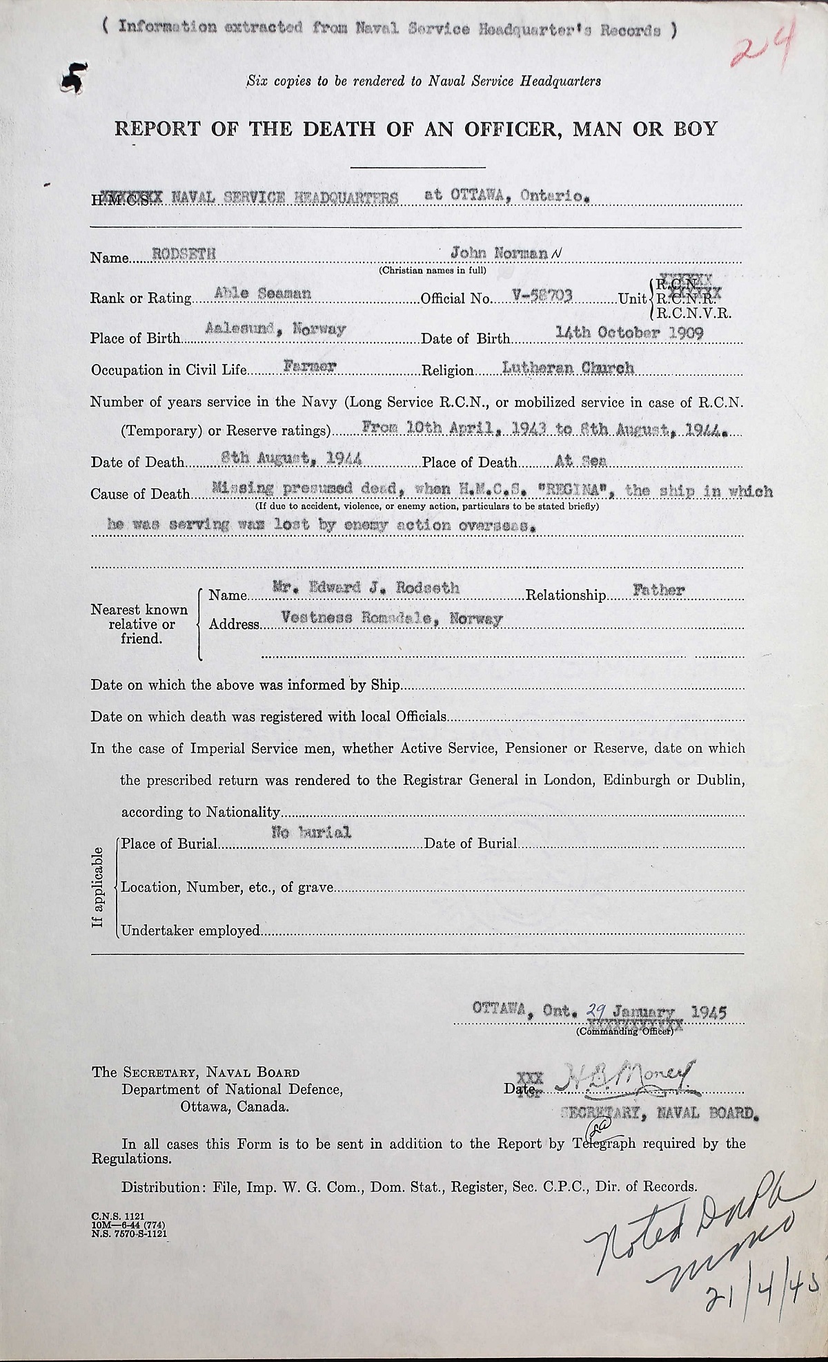 AB Rodseth died when HMCS REGINA was torpedoed and sunk off Trevose Head, Cornwall, England by U-667 while she was aiding a merchant vessel in distress. Thirty of her crew were lost.