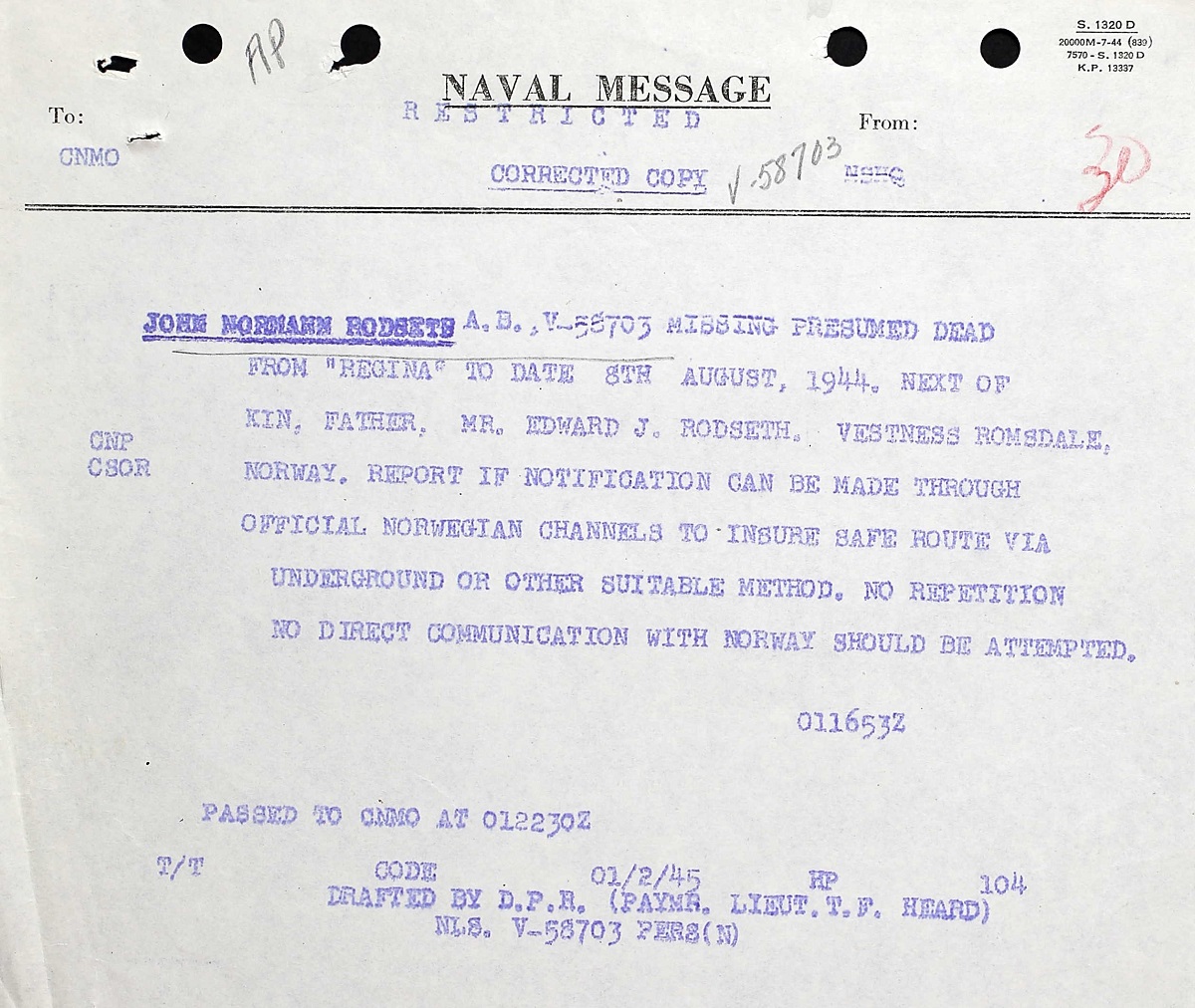 (JR01) Certificate of Service - pages 1 and 2 (JR02) Report of Death (JR03-JR04) Naval message and letter on concerns of informing AB Rodseth's next-of-kin who live in German occupied Norway