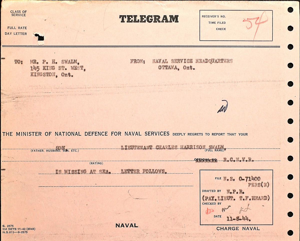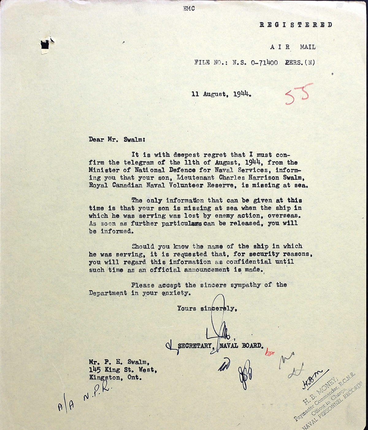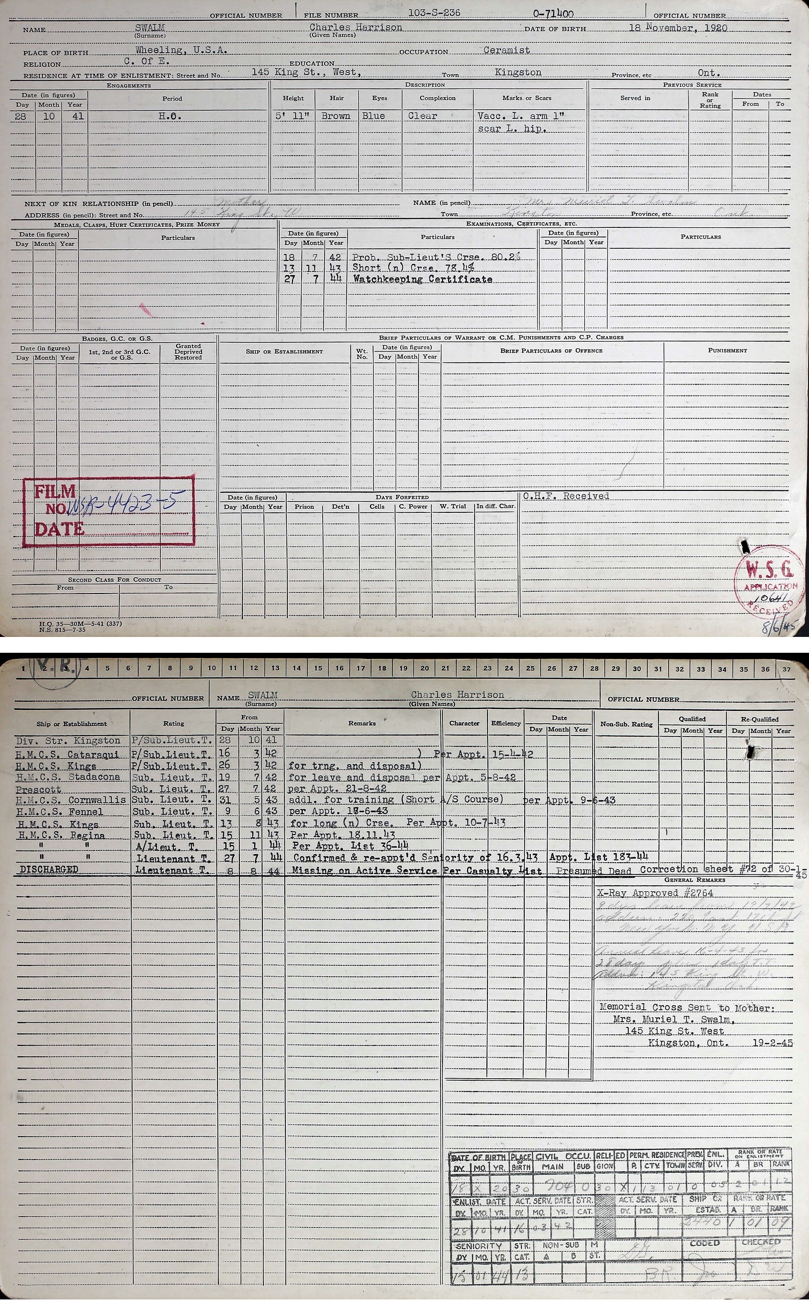 SWALM, Charles Harrison, Lt, RCNVR, MPK - 08 Aug 1944, HMCS REGINA - Son of Phaon H. and Muriel T. Swalm, of Kingston, Ontario.