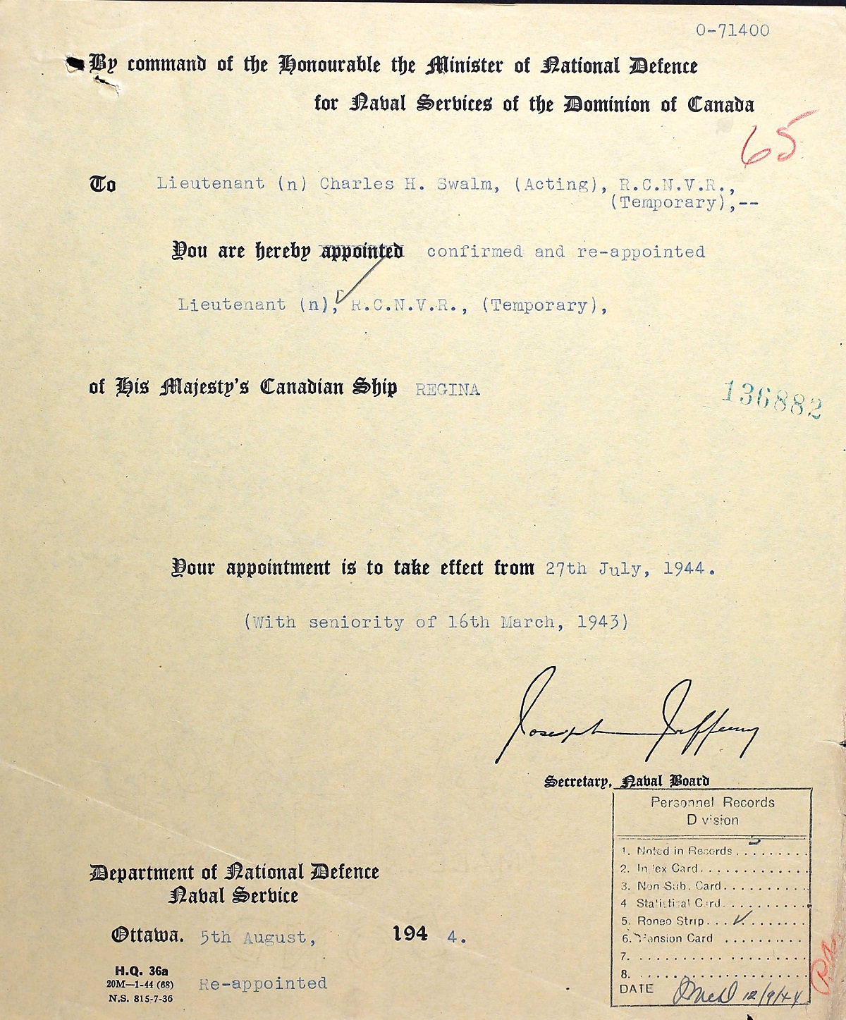 (CS01) Portrait of Lt Swalm (CS02) Record of Service (CS03) Appointment to HMCS REGINA (CS04) Report of Death (CS05) Telegram to Lt Swalm's father