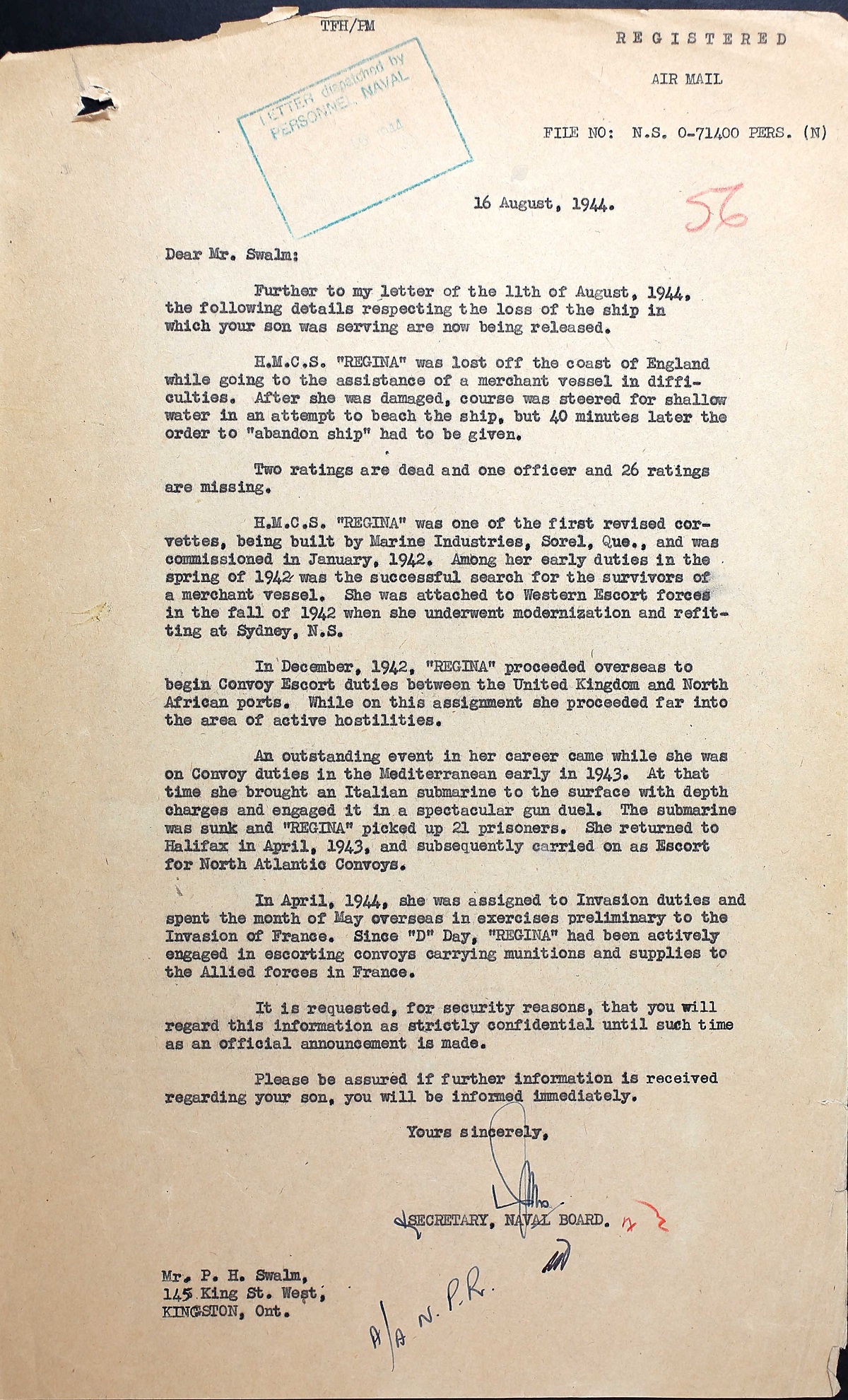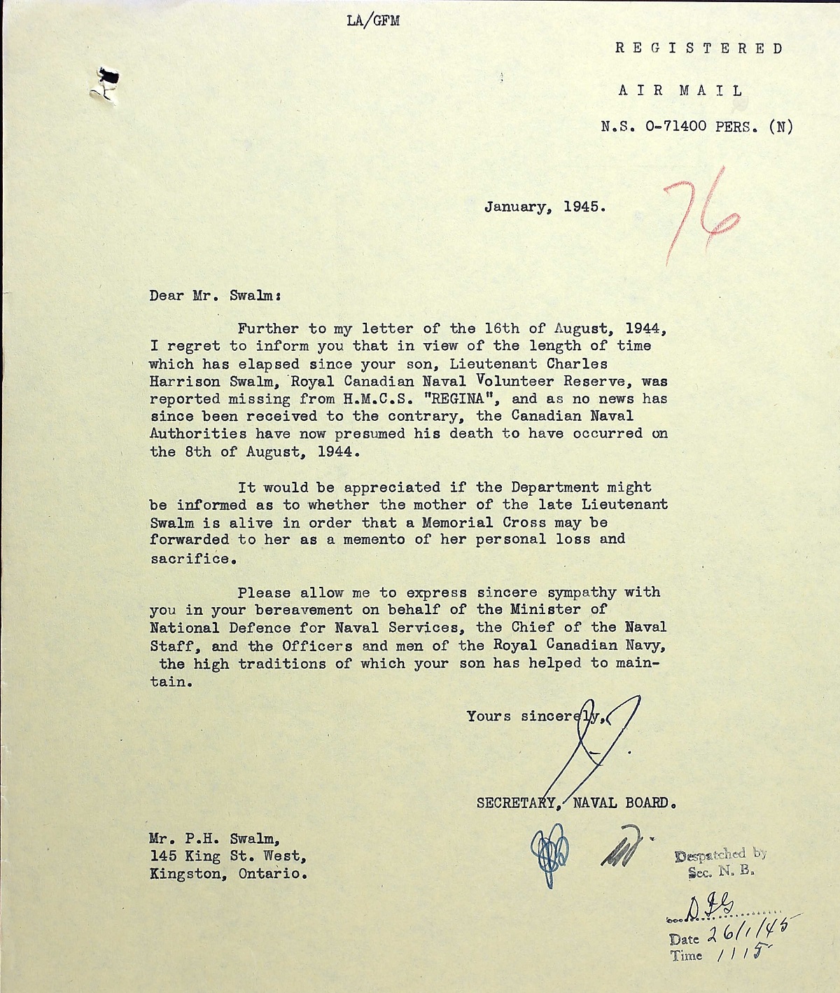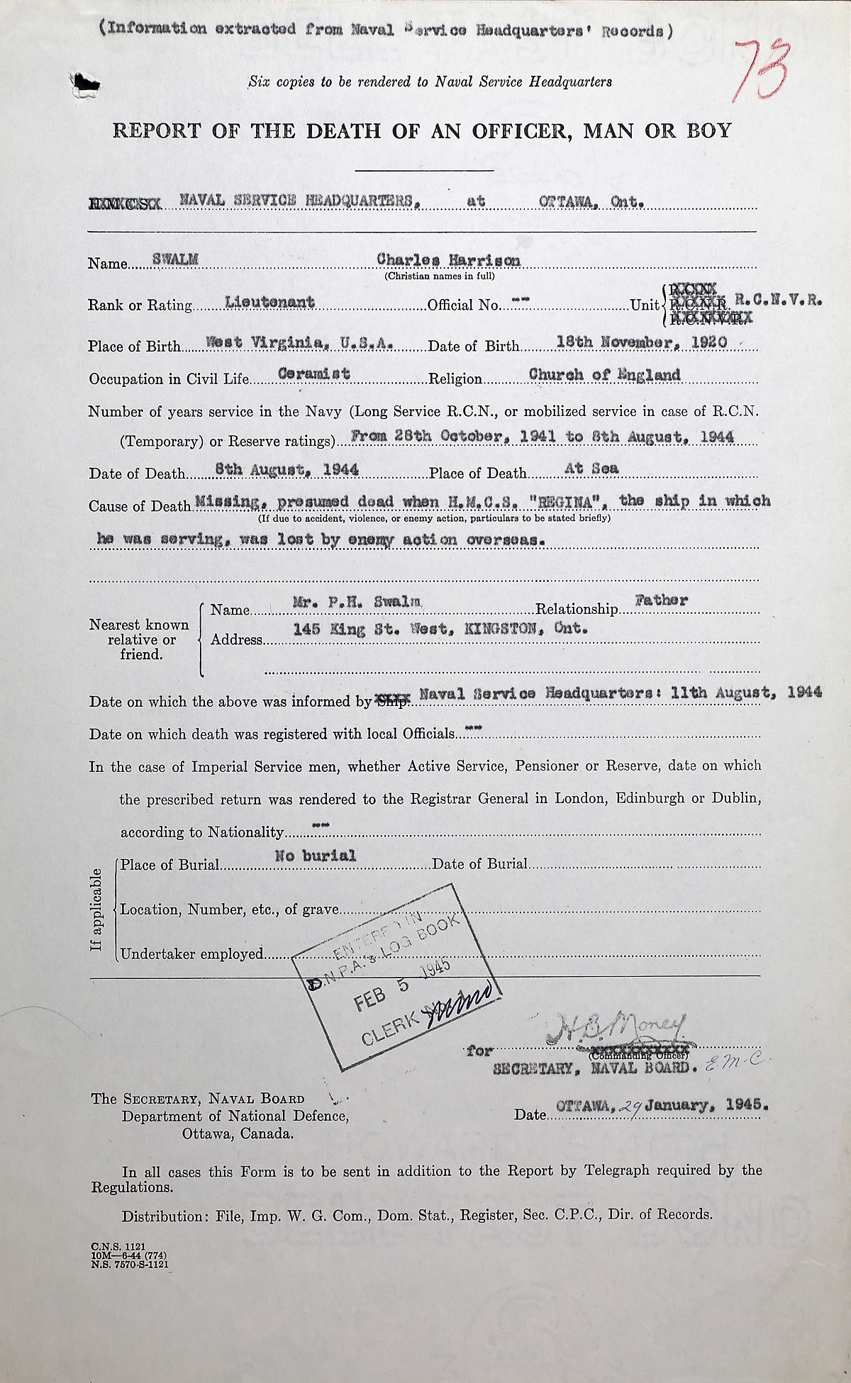 Lt Swalm died when HMCS REGINA was torpedoed and sunk off Trevose Head, Cornwall, England by U-667 while she was aiding a merchant vessel in distress. Thirty of her crew were lost.