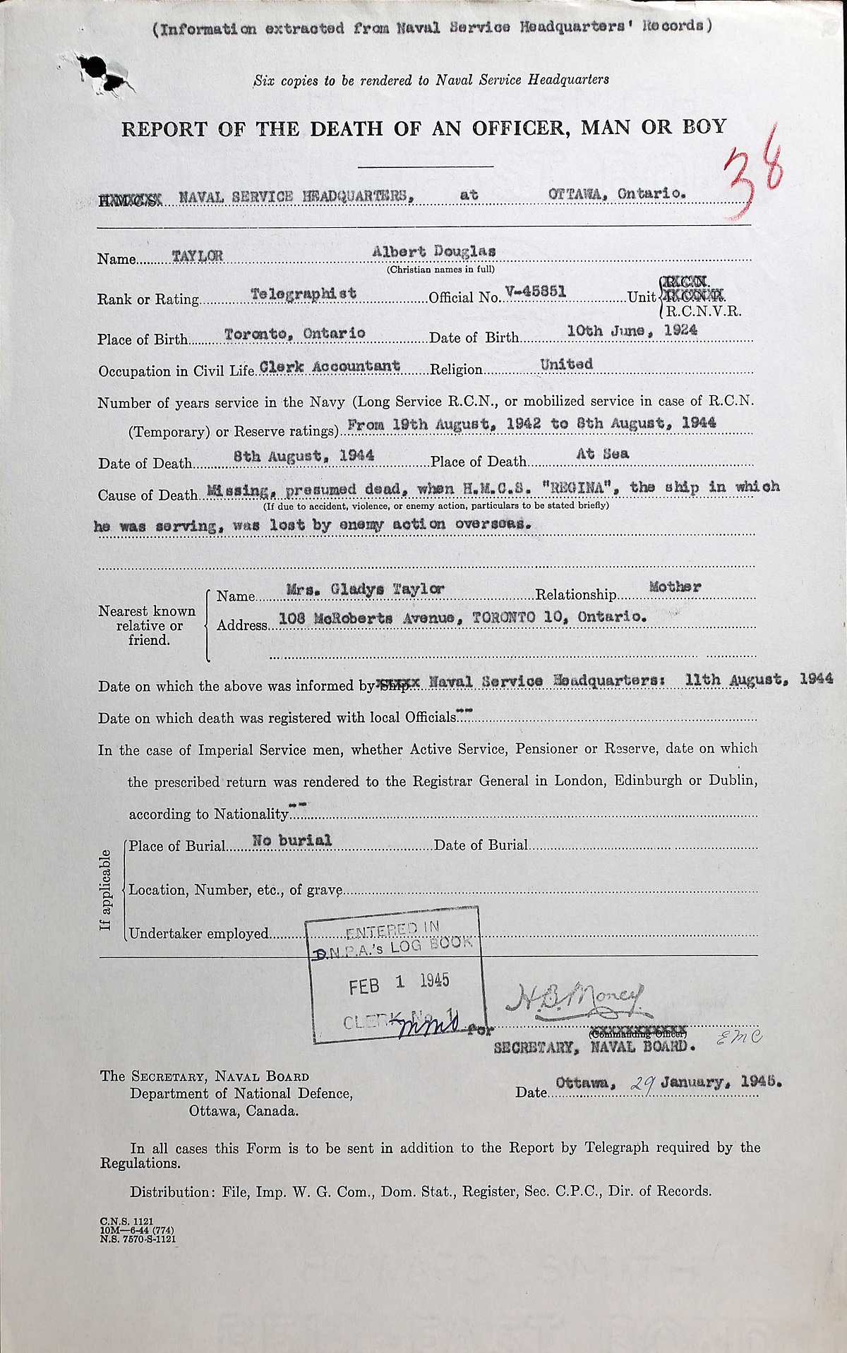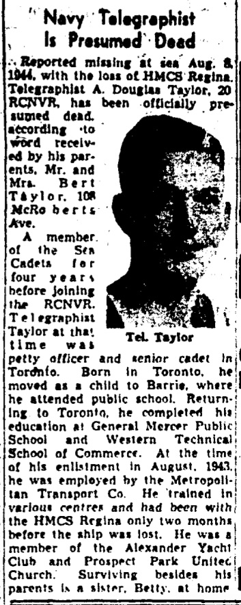 Albert Douglas Taylor, Telegraphist - 20, RCNVR, reported missing at sea Aug 8 with the loss of HMCS Regina, is now presumed dead, his parents, Mr. and Mrs. Bert Taylor, McRoberts Ave., have been informed. He was petty officer and senior cadet with the Sea Cadets before joining the RCNVR. Born in Toronto, he moved as a child to Barrie, where he got his early education, which he completed at Western Commercial, Toronto. When he enlisted in August, 1943, he was employed by Metropolitan Transport Co. He had been with the Regina two months to the day when it was lost. Telegraphist Taylor was a member of the Alexandra yacht club and of Prospect Park United church. A sister, Betty, is at home. (Toronto Star, 31 Jan 1945, page 11)