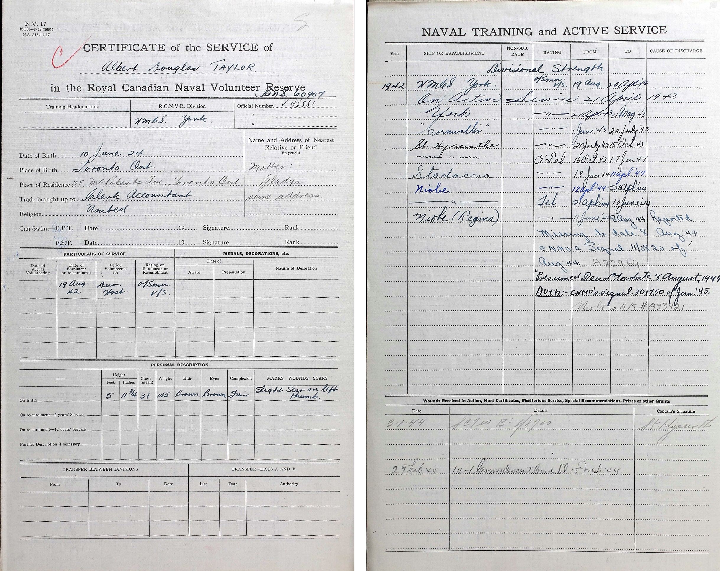 Ships served in: HMCS YORK - Enlisted 19 Aug 1942. Commenced Active Service 21 Apr 1942 as an OS VS, RCNVR HMCS CORNWALLIS - Drafted to CORNWALLIS 01 Jun 1943 as an OS VS, RCNVR HMCS ST HYACINTHE - Drafted to ST HYACINTHE 21 Jul 1942 as an OS, RCNVR * Rated O/Tel 16 Oct 1943 HMCS STADACONA - Drafted to STADACONA 18 Jan 1944 as an O/Tel, RCNVR HMCS NIOBE - Drafted to NIOBE 12 Apr 1944 as an O/Tel, RCNVR * Rated Tel 21 Apr 1944 HMCS REGINA - Drafted to REGINA 11 Jun 1944 as a Tel, RCNVR