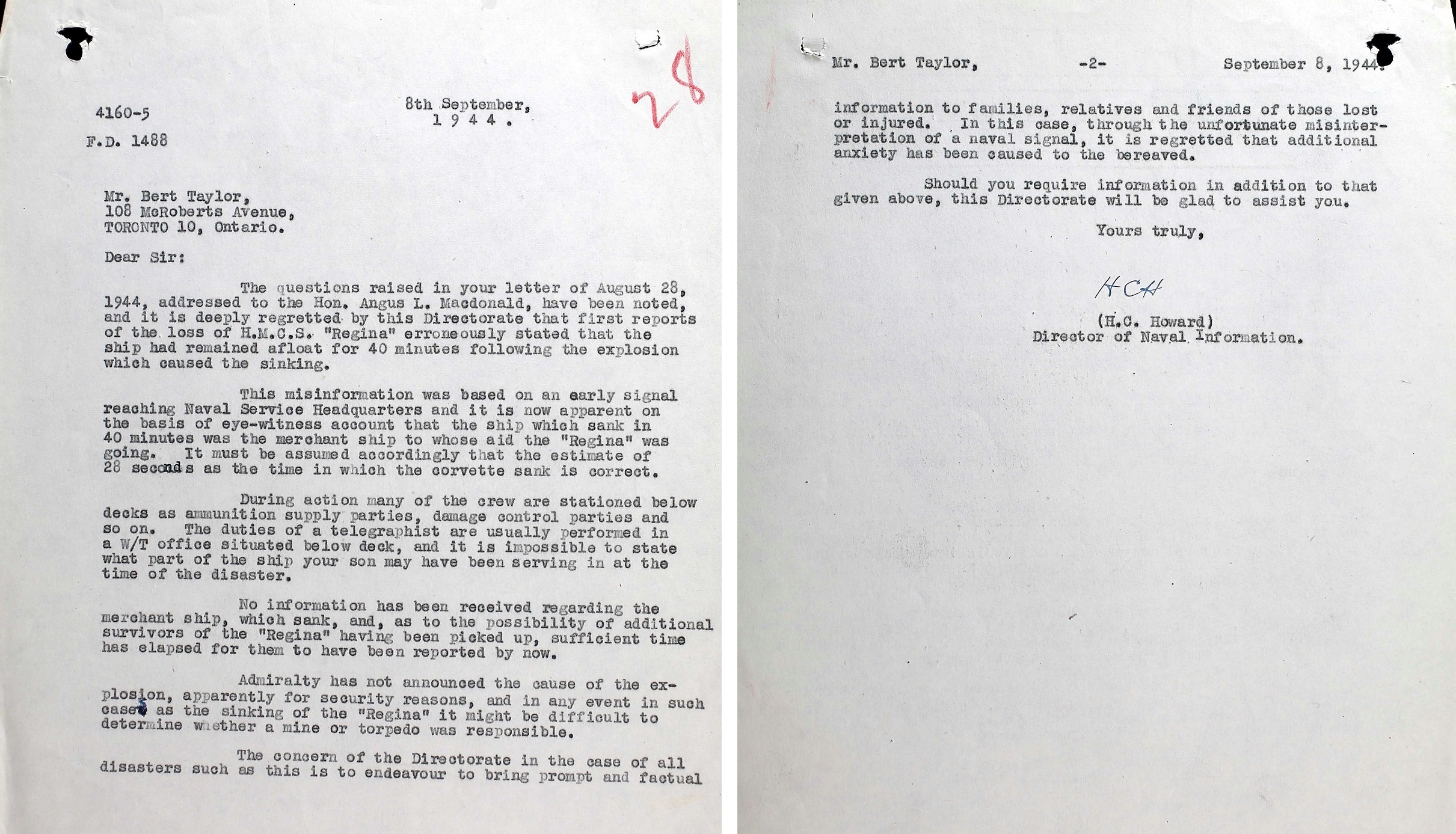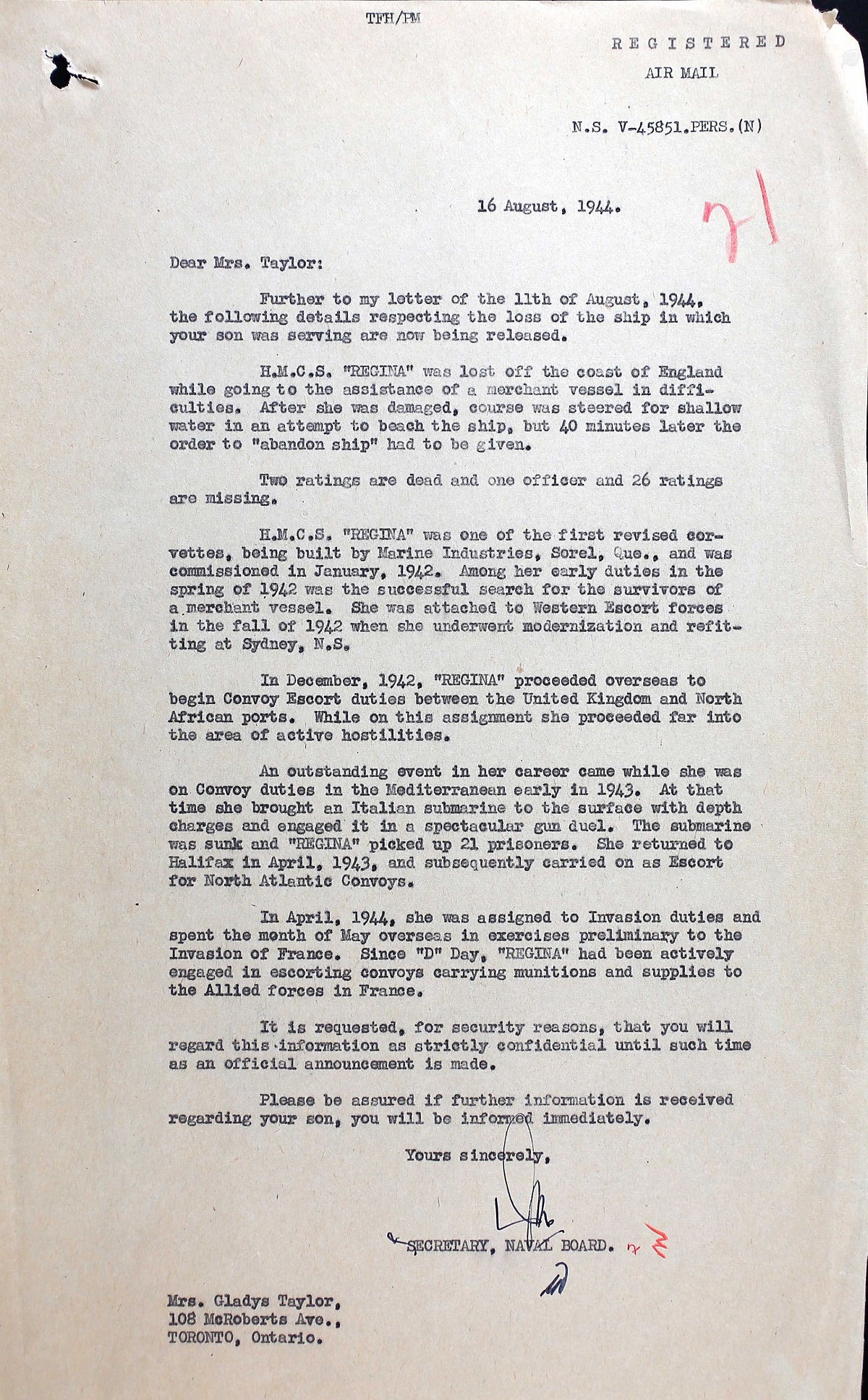 (AT01) Certificate of Service - pages 1 and 2 (AT02) Report of Death (AT03) Letter to Tel Taylor's mother (AT04) Letter to Tel Taylor's father (Bert Taylor) in response to a letter he wrote. It appears the Tel Taylor's father wrote a letter to Naval Service HQ about the death of his son and the information contained in the letter to Tel Taylor's mother. The information about REGINA remaining afloat for 40 minutes after being torpedoed was incorrect and she in fact sank less than one minute after being torpedoed. Mr. Taylor's letter to NSHQ is not in Tel Taylor's file.