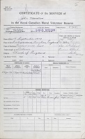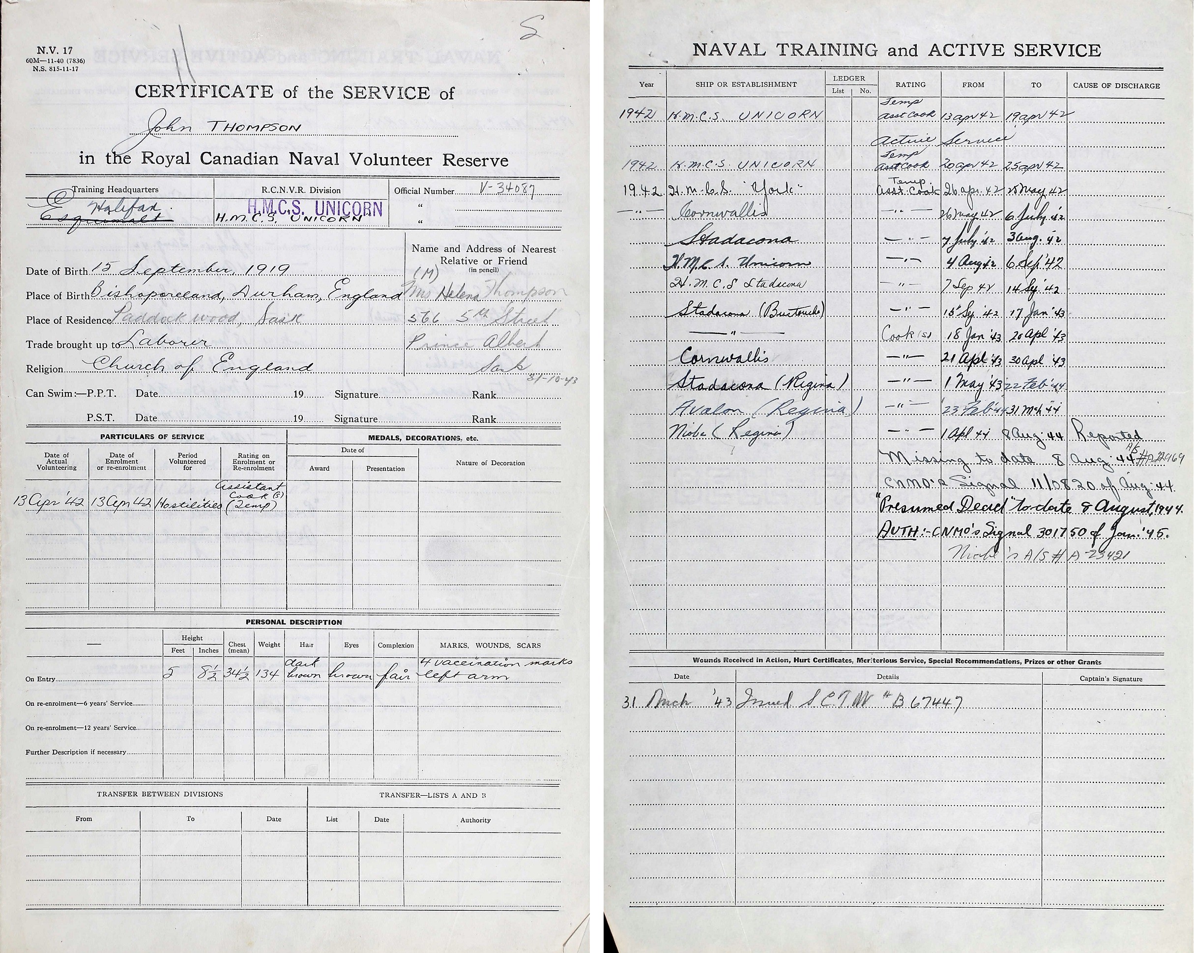 Ships served in: HMCS UNICORN - Enlisted 13 Apr 1942. Commenced Active Service 20 Apr 1942 as an Ass't Cook, RCNVR HMCS YORK - Drafted to YORK 26 Apr 1942 as an Ass't Cook, RCNVR HMCS CORNWALLIS - Drafted to CORNWALLIS 26 May 1942 as an Ass't Cook, RCNVR HMCS STADACONA - Drafted to STADACONA 07 Jul 1942 as an Ass't Cook, RCNVR HMCS UNICORN for Agricultural Leave - 04 Aug 1942 - 06 Sep 1942 HMCS STADACONA - Drafted to STADACONA 07 Sep 1942 as an Ass't Cook, RCNVR HMCS BUCTOUCHE - Drafted to BUCTOUCHE 15 Sep 1942 as an Ass't Cook, RCNVR * Rated Cook (S) 18 Jan 1943 HMCS CORNWALLIS - Drafted to CORNWALLIS 21 Apr 1943 as a Cook (S), RCNVR HMCS REGINA - Drafted to REGINA 01 May 1943 as a Cook (S), RCNVR