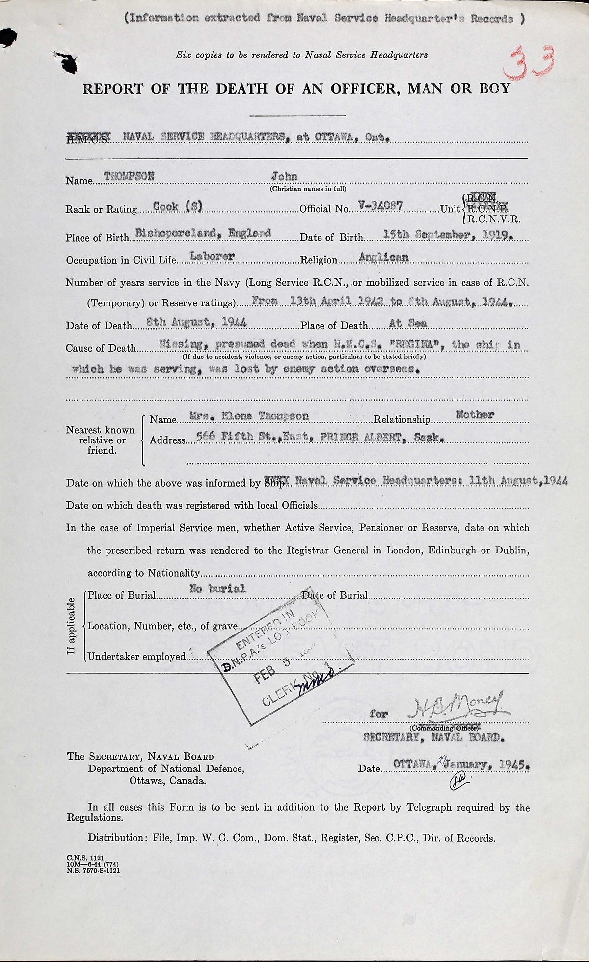 THOMPSON, John, Ck (S), V34087, RCNVR, MPK - 08 Aug 1944, HMCS REGINA - Son of Robert Parker Thompson and Helena Thompson, of Prince Albert, Saskatchewan.