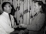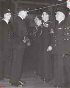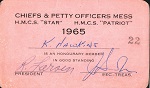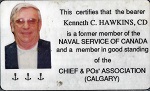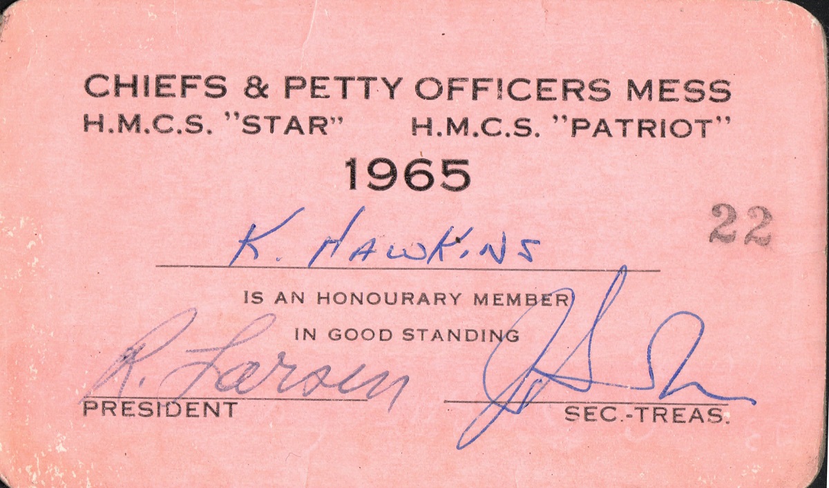 (KH01) Seaman Kenneth Hawkins (KH02) Petty Officer Hawkins being addressed by the Inspecting Officer during divisions (KH03) CPO Hawkins receiving his retirement gift of gold cufflinks. He was also presented with a sliver mug (KH05) C&POs Mess Card for HMCS STAR and HMCS PATRIOT (KH05) C&POs Association Card - Calgary