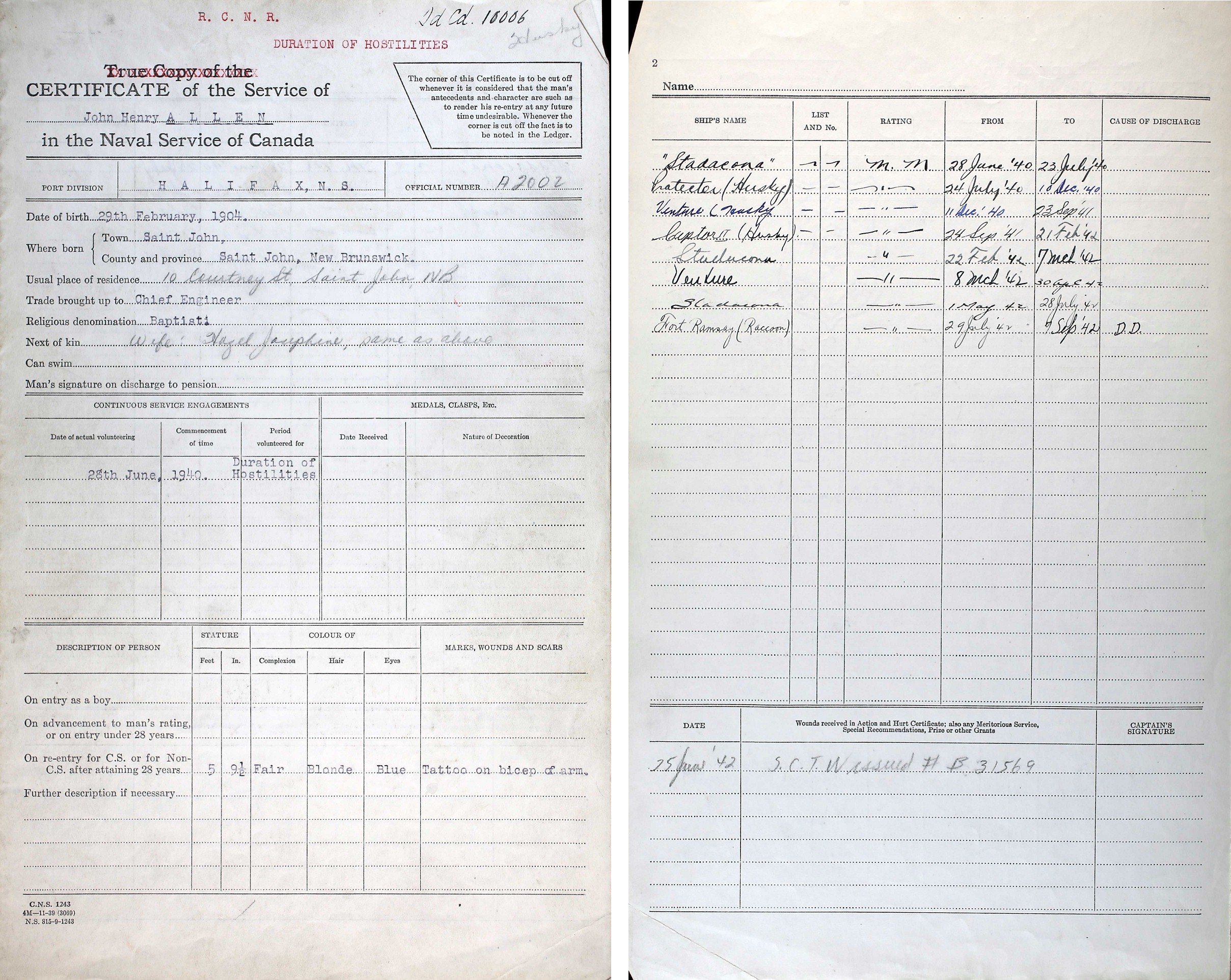 MM Allen died when his ship, HMCS RACCOON, which was on convoy escort in the St. Lawrence River off the Gaspé Peninsula, was hit and sunk by two torpedoes from U165. All 37 hands were lost. Prior to enlisting he was the Chief Engineer on "Ocean Transport 24" for the Saint John Tow Boat Co., Saint John, NB.