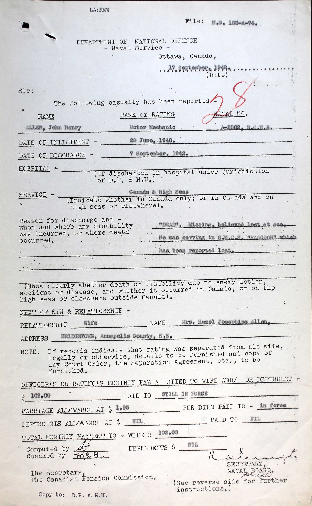 ALLEN, John Henry, MM, A2002, RCNR, MPK - 07 Sep 1942, HMCS RACCOON - Son of John Henry and Eliza May Allen. Husband of Hazel Josephine Allen, of Bridgetown, Nova Scotia.
