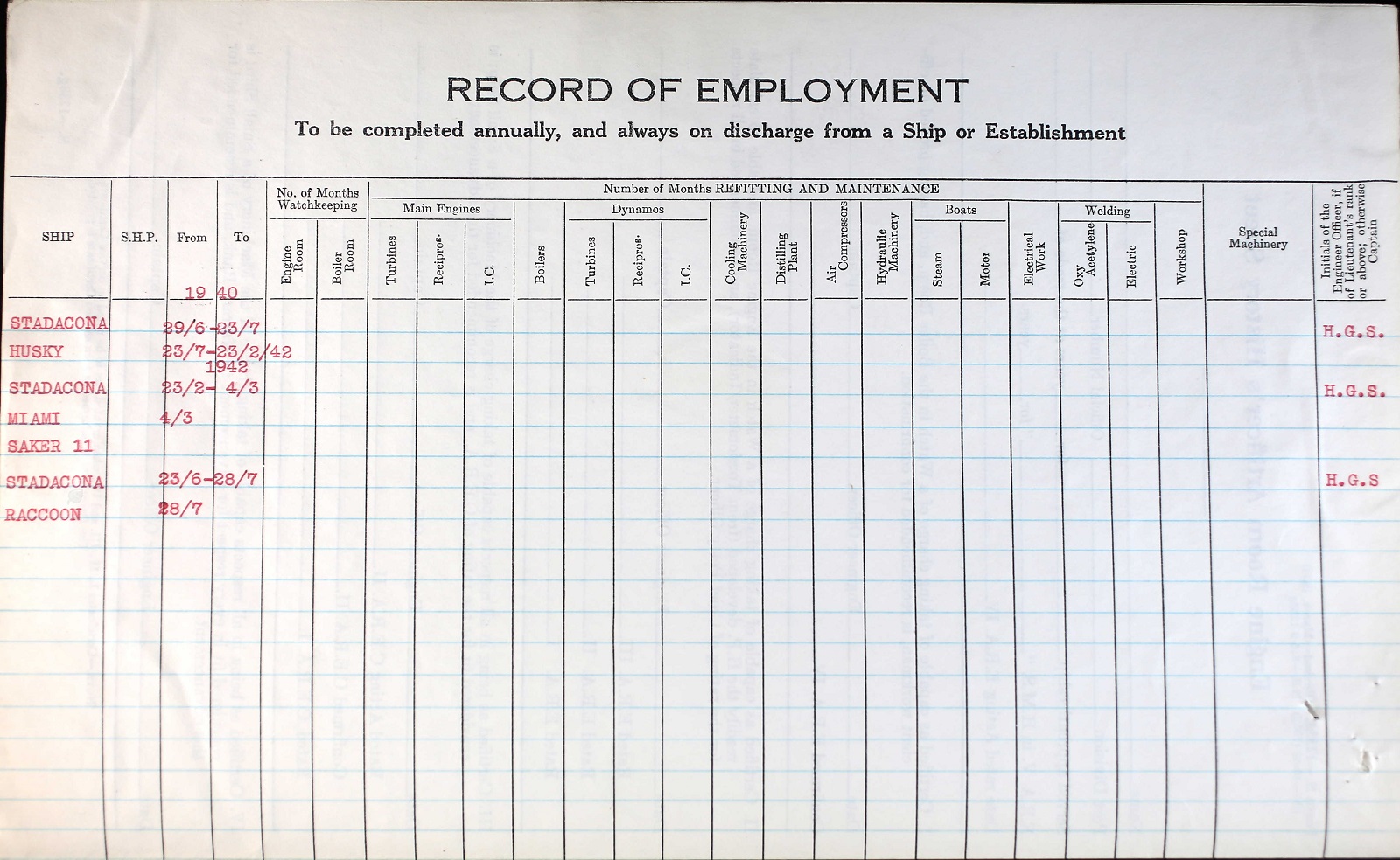 Ships served in: HMCS CAPTOR II (STADACONA for) - Enlisted 28 Jun 1940 as a MM, RCNR HMCS HUSKY - Drafted to HUSKY 24 Jul 1940 as a MM, RCNR HMCS STADACONA - Drafted to STADACONA 22 Feb 1942 as a MM, RCNR HC MIAMI (STADACONA for) - Drafted to MIAMI 04 Mar 1942 SAKER II / HC65 (STADACONA for) - undated HMCS VENTURE - Drafted to VENTURE 08 Mar 1942 as an MM, RCNR HMCS STADACONA - Drafted to STADACONA 01 May 1942 as a MM, RCNR HMCS RACCOON - Drafted to RACCOON 29 Jul 1942 as a MM, RCNR