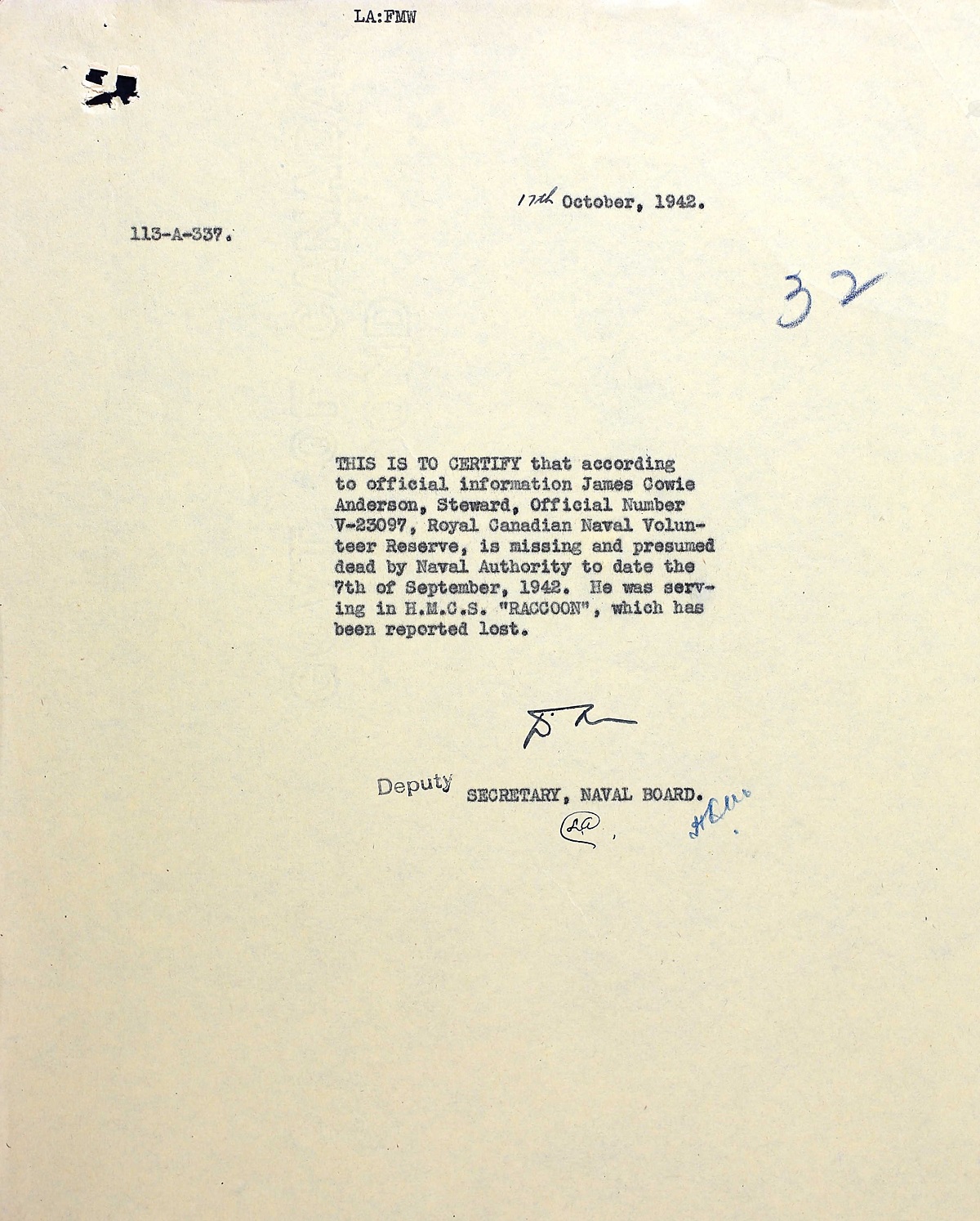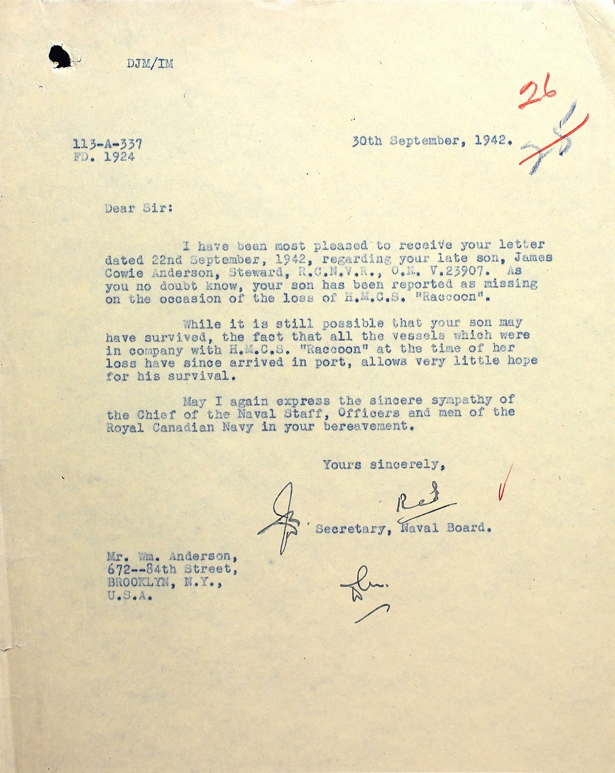 ANDERSON, James Cowie, Stwd, V23097, RCNVR, MPK - 07 Sep 1942, HMCS RACCOON - Son of William M. and Anne Anderson, of Brooklyn, New York.