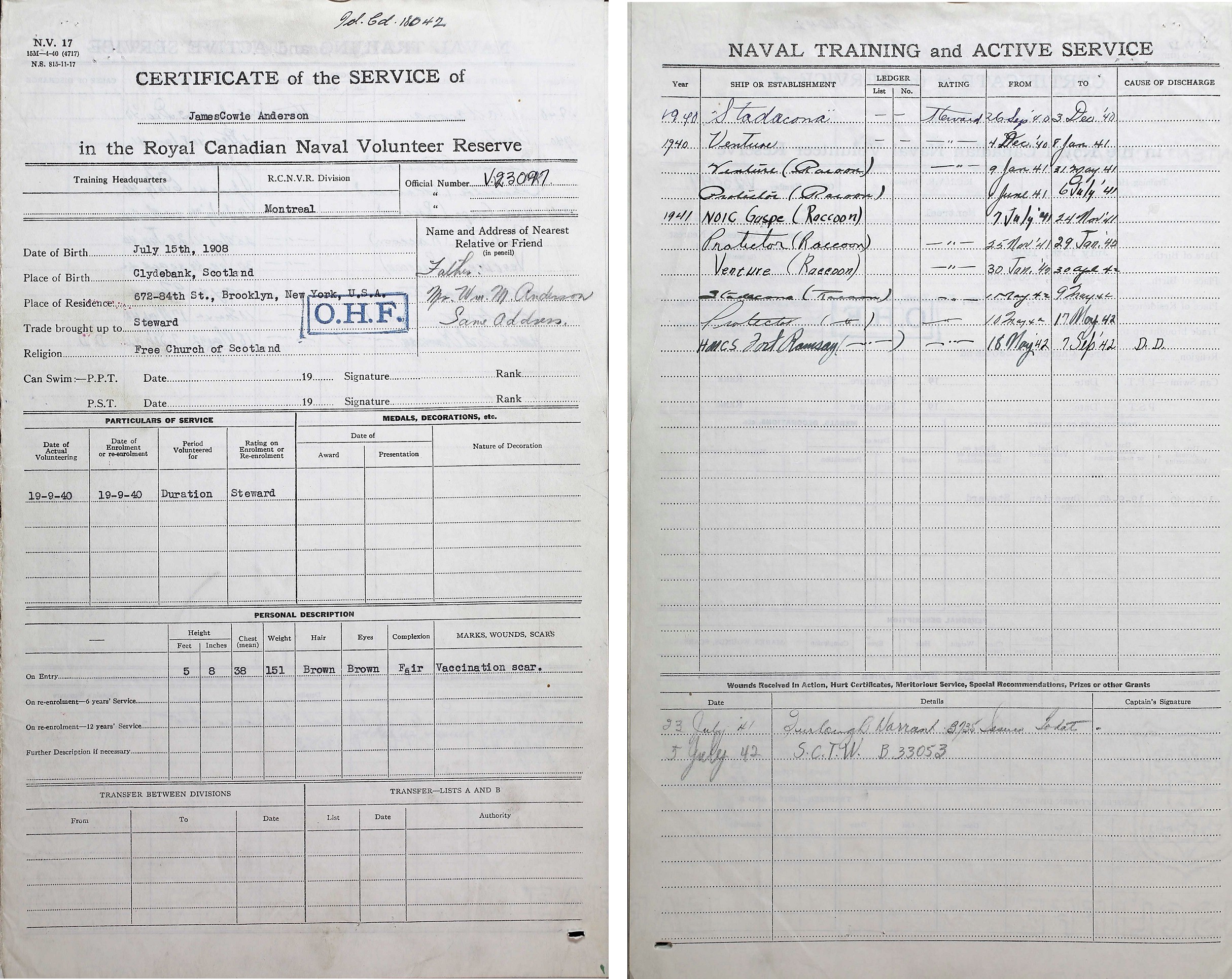 Ships served in: MONTREAL DIVISION RCNVR - Enlisted 19 Sep 1940. Commenced Active Service 24 Sep 1940. HMCS STADACONA - Drafted to STADACONA 26 Sep 1940 as a Stwd, RCNVR HMCS VENTURE - Drafted to VENTURE 04 Dec 1940 as a Stwd, RCNVR HMCS RACCOON - Drafted to RACCOON 09 Jan 1941 as a Stwd, RCNVR