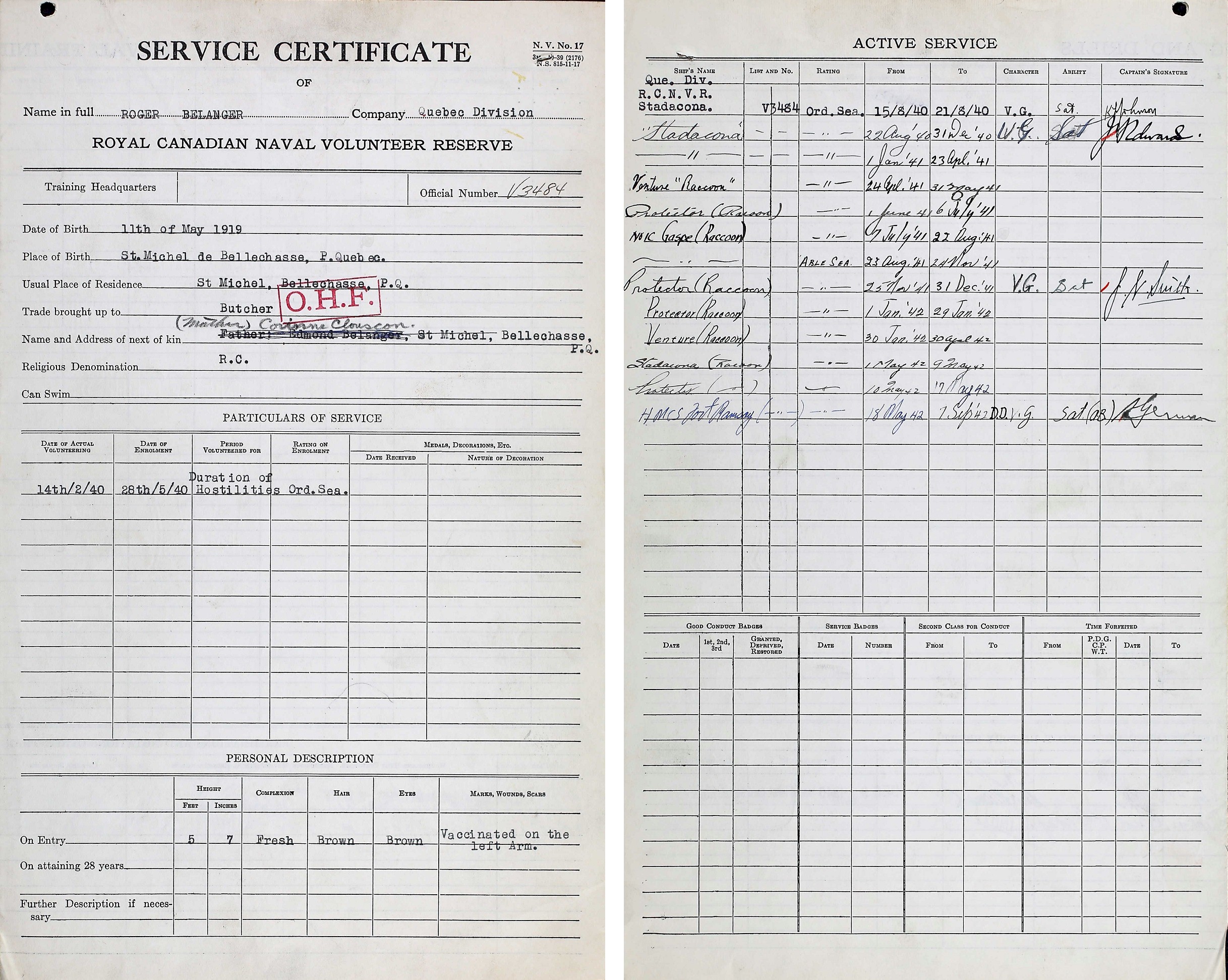 Ships served in: QUEBEC DIVISION RCNVR - Enlisted 28 May 1940. Commenced Active Service 15 Aug 1940 HMCS STADACONA - Drafted to STADACONA 22 Aug 1940 as an OS, RCNVR HMCS RACCOON - Drafted to RACCOON 24 Apr 1941 as an OS, RCNVR * Rated AB 23 Aug 1941