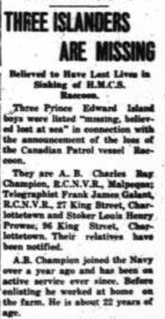 CHAMPION, Charles Ray, AB, A697, RCNR, MPK - 07 Sep 1942, HMCS RACCOON - Son of Charles and Bertha Jane Champion, of Malpeque, Prince Edward Island.