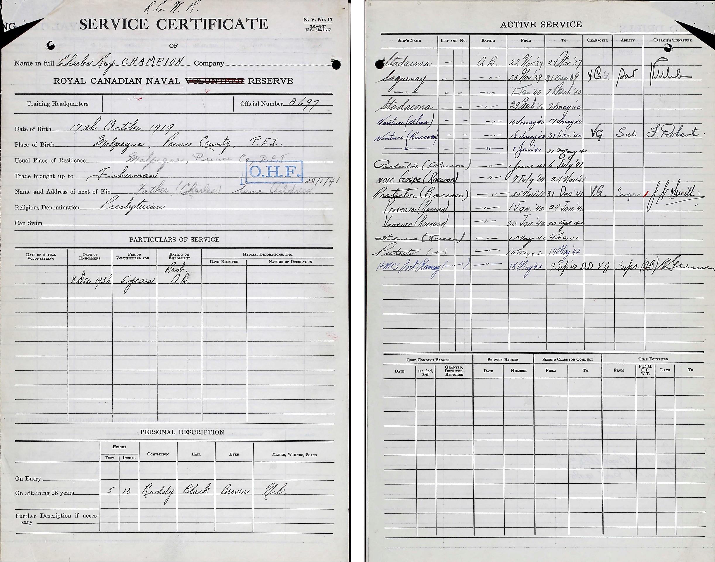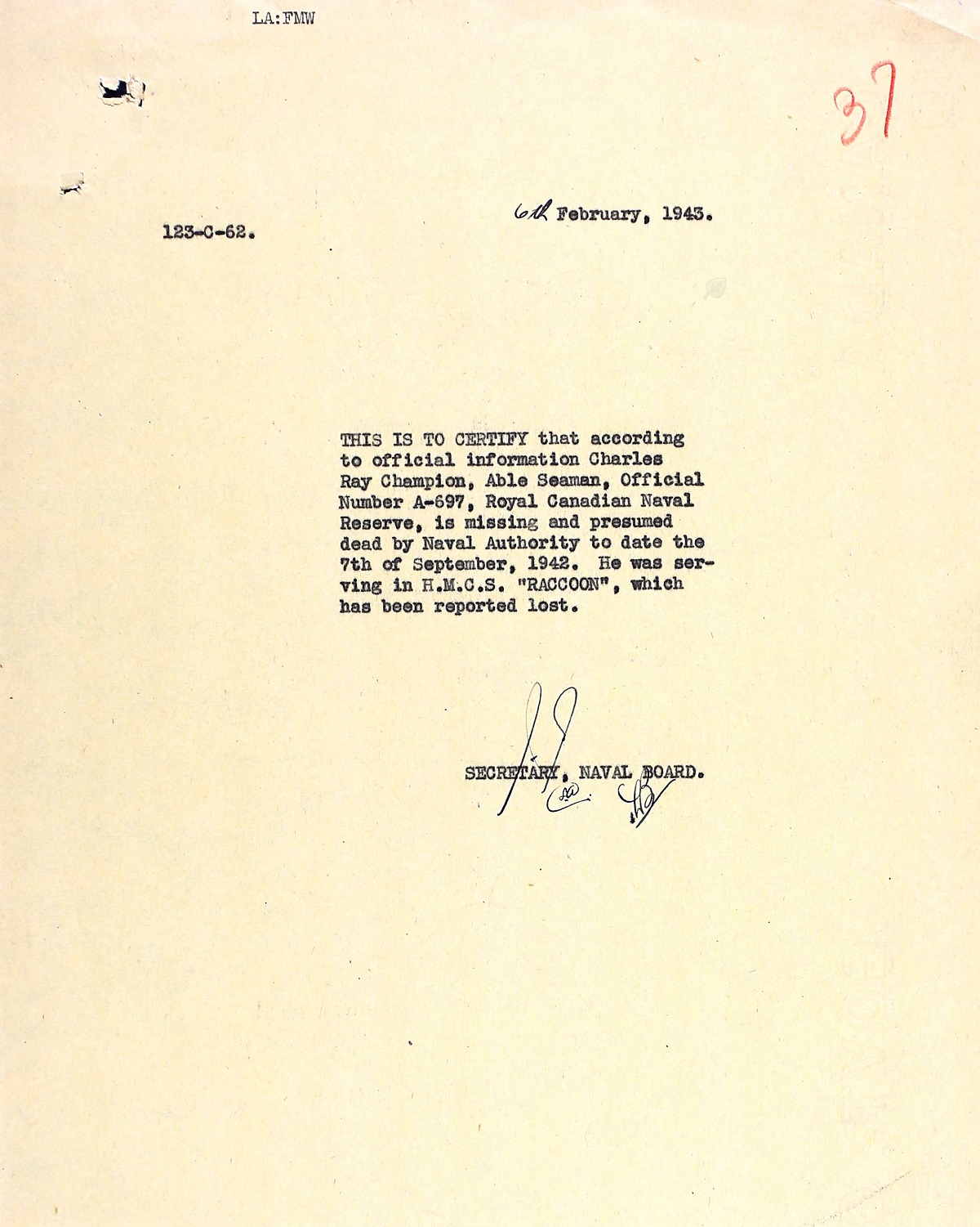 AB Champion died when his ship, HMCS RACCOON, which was on convoy escort in the St. Lawrence River off the Gaspé Peninsula, was hit and sunk by two torpedoes from U165. All 37 hands were lost.