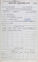 Ships served in: REGINA DIVISION RCNVR - Enlisted 31 May 1940. Commenced Active Service 27 Aug 1940 as an OS, RCNVR HMCS NADEN - Drafted to NADEN 27 Oct 1940 as an OS, RCNVR * Rated A/SD 26 Feb 1941 HMCS SANS PEUR - Drafted to SANS PEUR 08 Mar 1941 as an OS, RCNVR HMCS NADEN - Drafted to NADEN 04 Apr 1941 as an OS, RCNVR HMCS STADACONA - Drafted to STADACONA 18 Apr 1941 as an OS, RCNVR * Re-qualified A/SD 16 May 1941 HMCS RACCOON - Drafted to RACCOON 29 May 1941 as an OS, RCNVR * Rated AB 16 Jun 1941