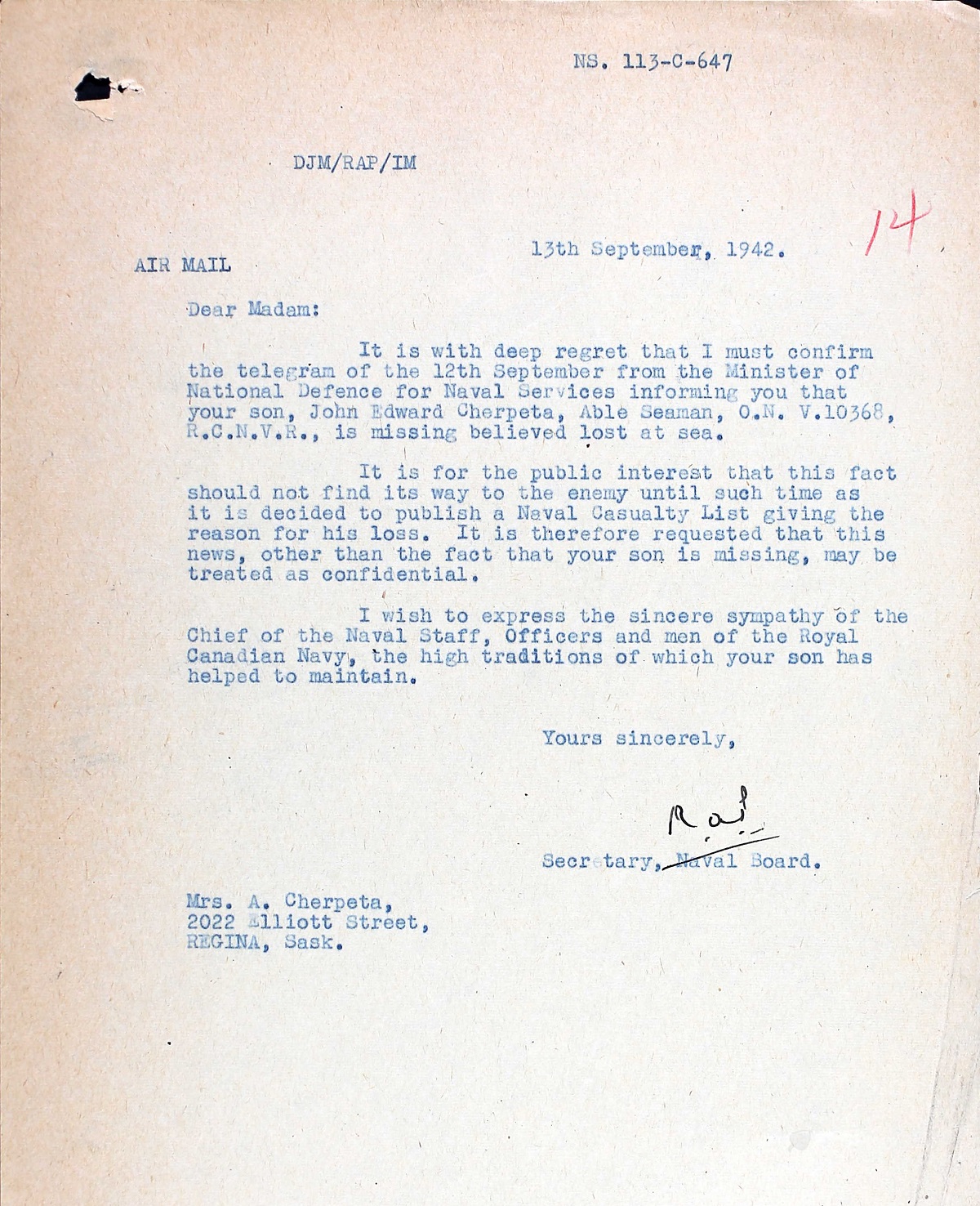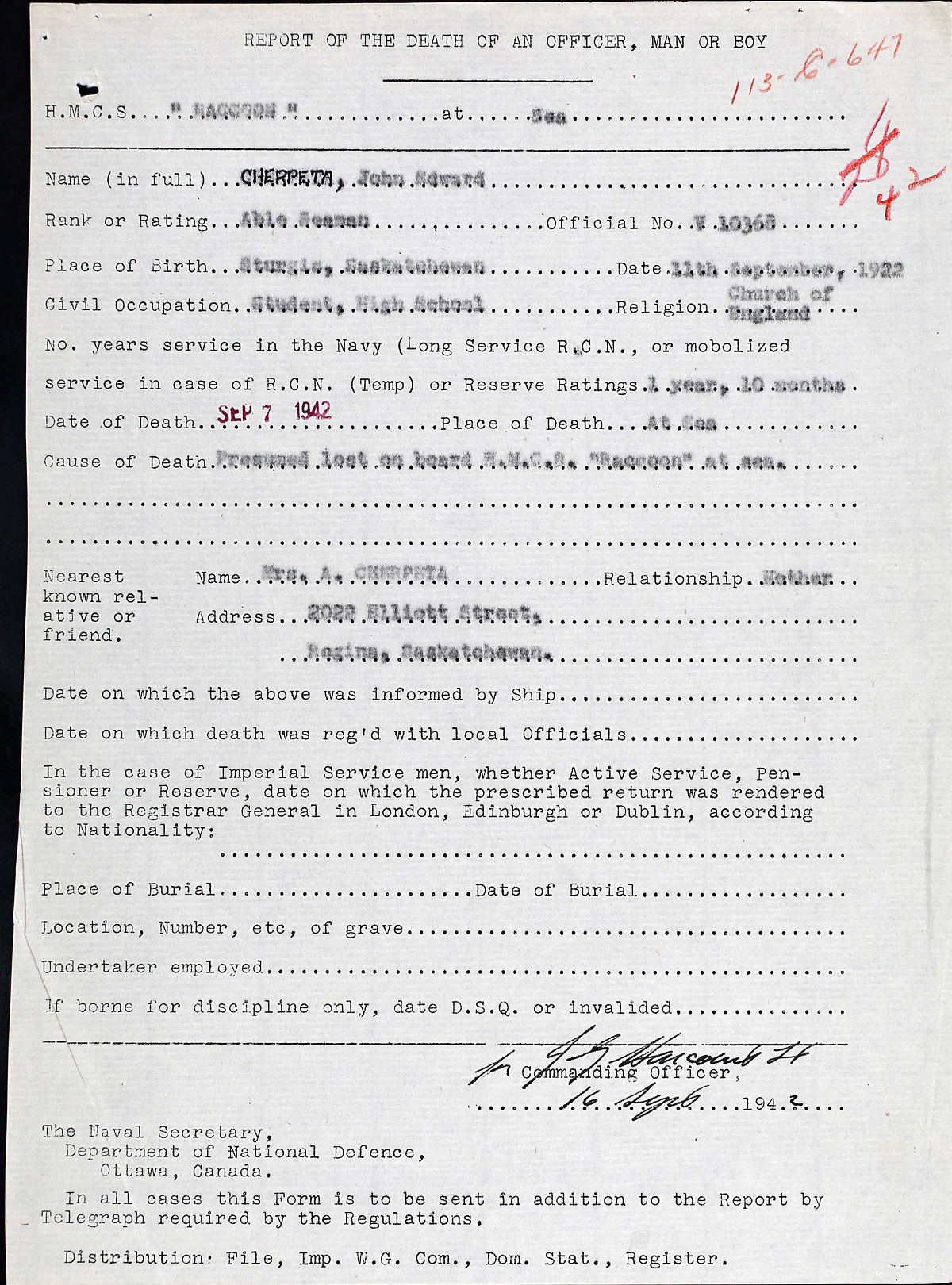 CHERPETA, John Edward, AB, V10368, RCNVR, MPK - 07 Sep 1942, HMCS RACCOON - Son of Alex and Anne Cherpeta, of Regina, Saskatchewan.